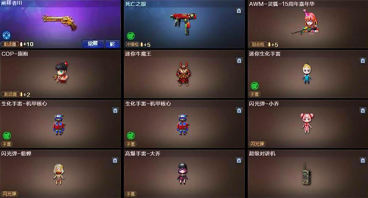 【热门武器】:G36C-幻影,QBZ03-金色蔷薇,HK417-朱雀,M4A1-青龙,金色蔷薇-古蛇迷踪,修罗-古蛇迷踪,死亡之眼,凤吟之魄,Kar98K-星神,M4A1-黑骑士,汤姆逊-烈龙*6,RPK-盘龙*4,加特林-炼狱*2,沙鹰-修罗*6,金刚伞,高爆手雷-幻兽*4