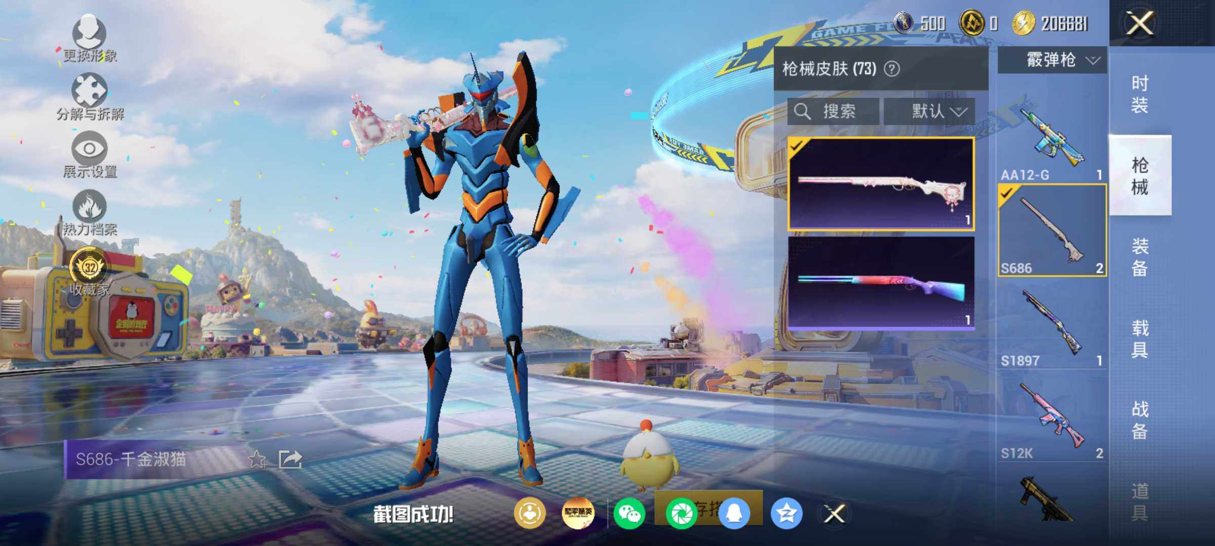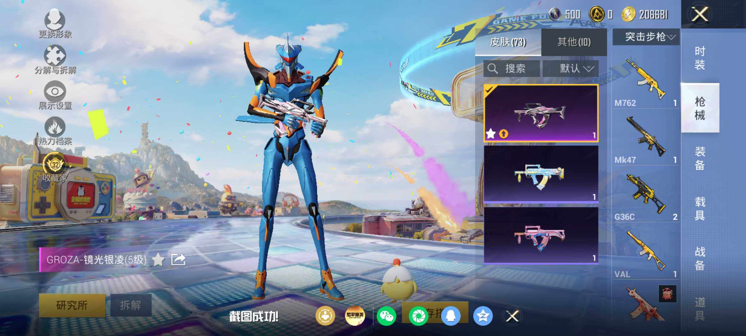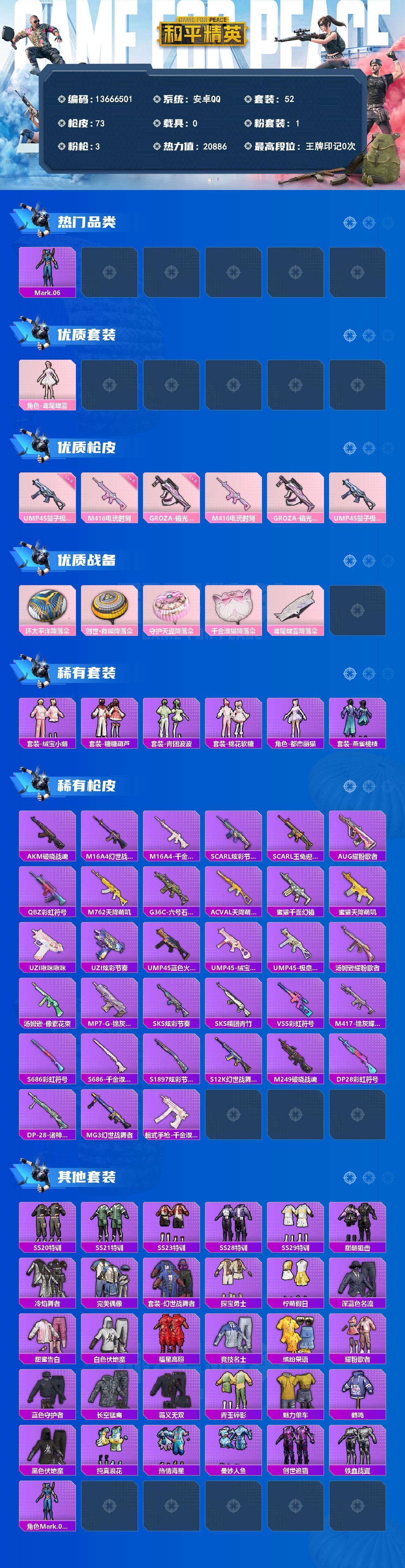 52套装/枪械3/装备83/战备41/热力值20886/五级M416-电玩时刻/五级GROZA-镜光银凌/五级UMP45-量子极限/角色-Mark.06/角色-鸢尾珑雾/M416-电玩时刻/GROZA-镜光银凌/UMP45-量子极限/环太平洋降落伞/创世·救赎降落伞/守护天翼降落伞/千金淑猫降落伞/鸢尾珑雾降落伞/绒宝小鹅/套装-糖糖葫芦/套装-青团波波/套装-棉花软糖/角色-都市丽猫/套装-燕