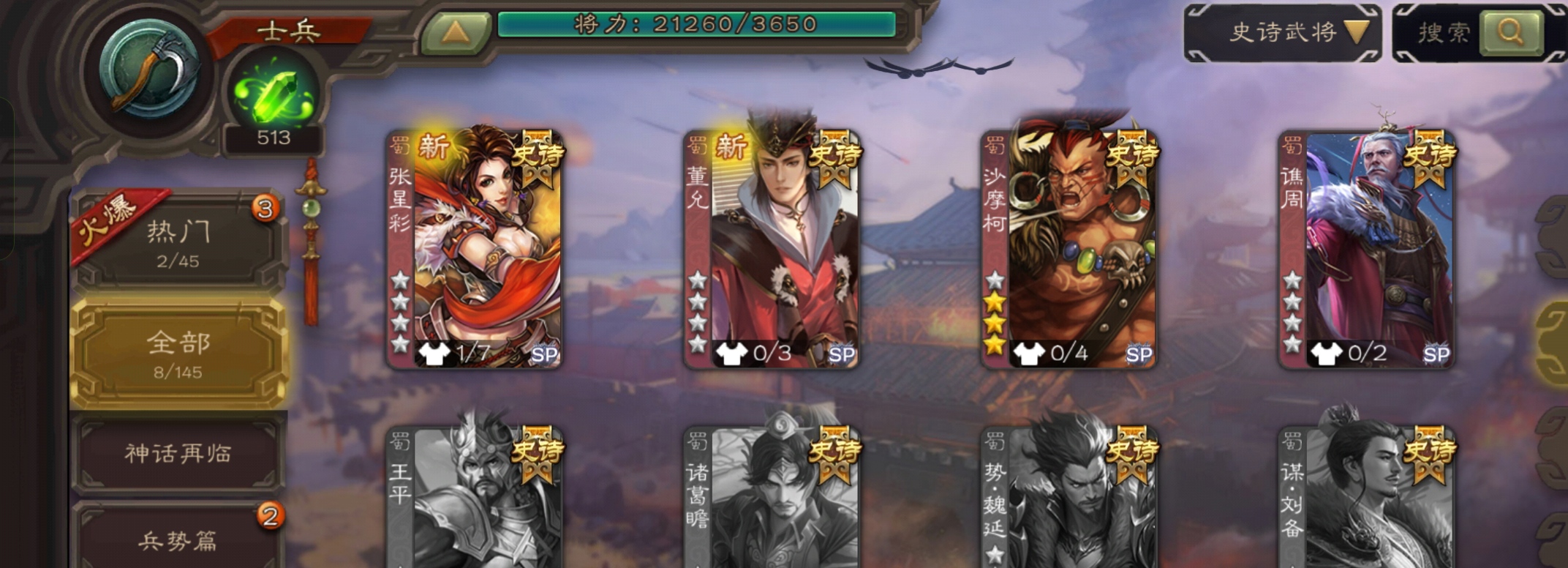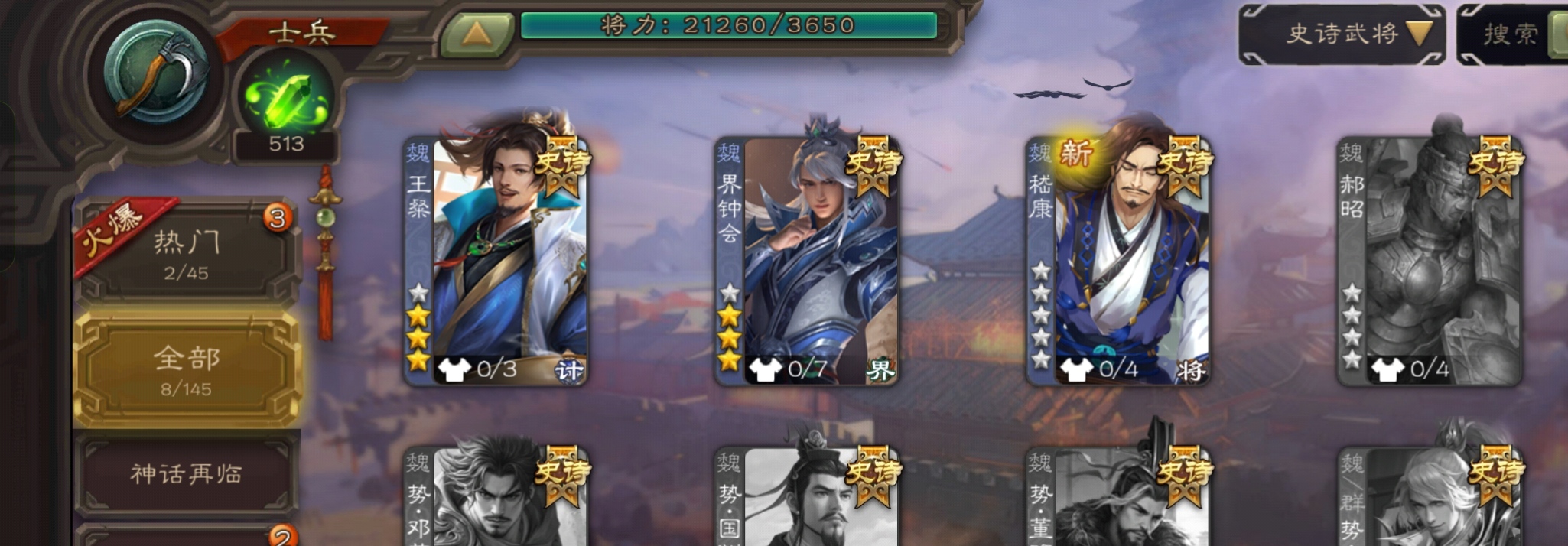 8史诗超级兵,8万羽毛,势太史慈界钟会沙摩柯王粲谯周张星彩董允嵇康,谋张郃骥李典,129招募令6万豆