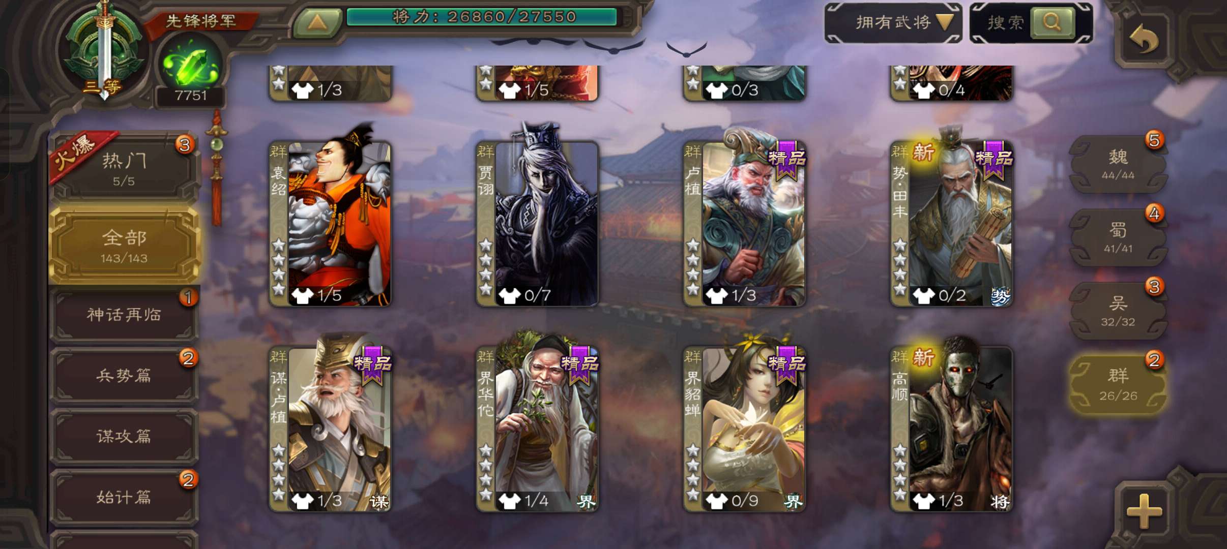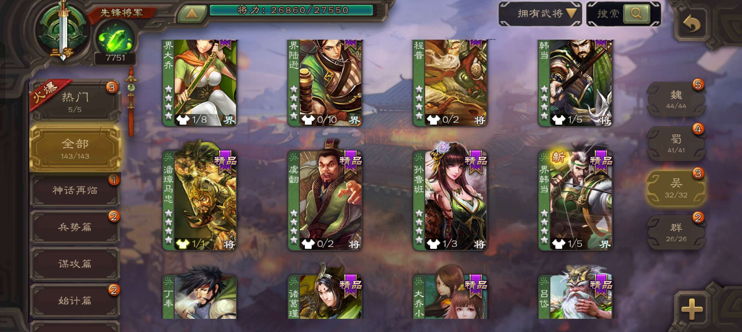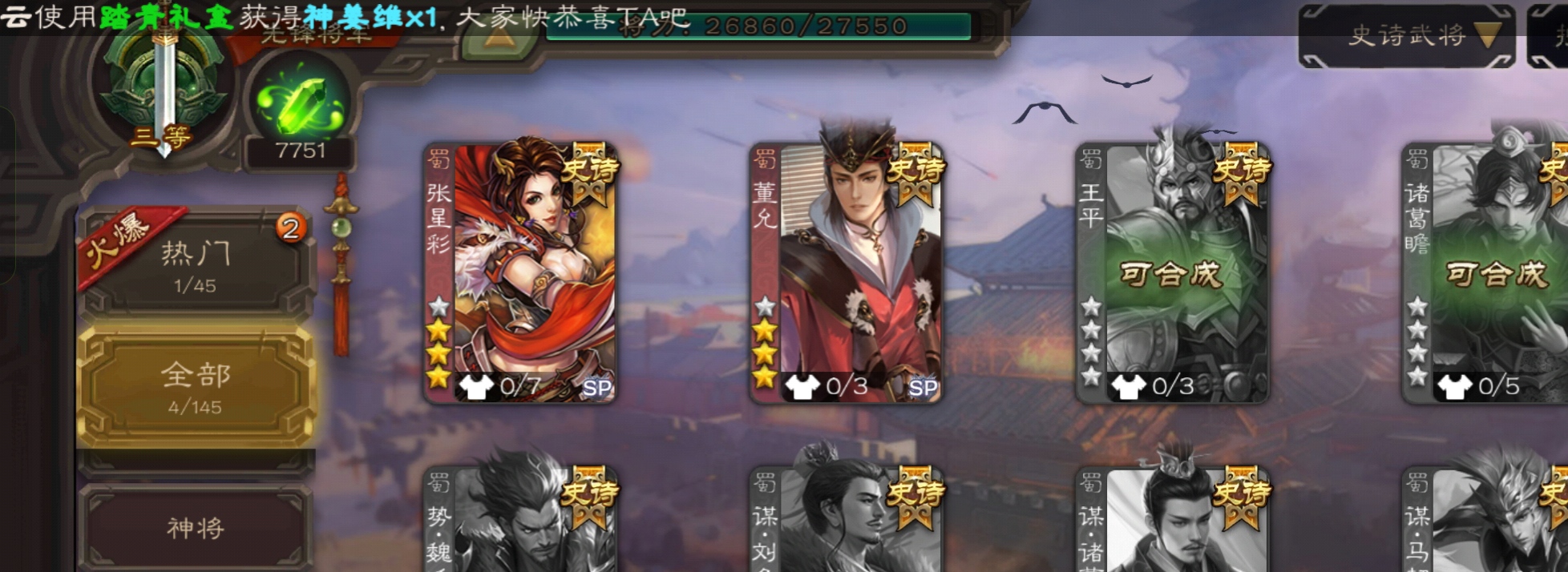 7700将魂7.9万羽毛,势太史慈界曹真张星彩董允4史诗先锋,关银屏骥李典谋韩当谋卢植143将