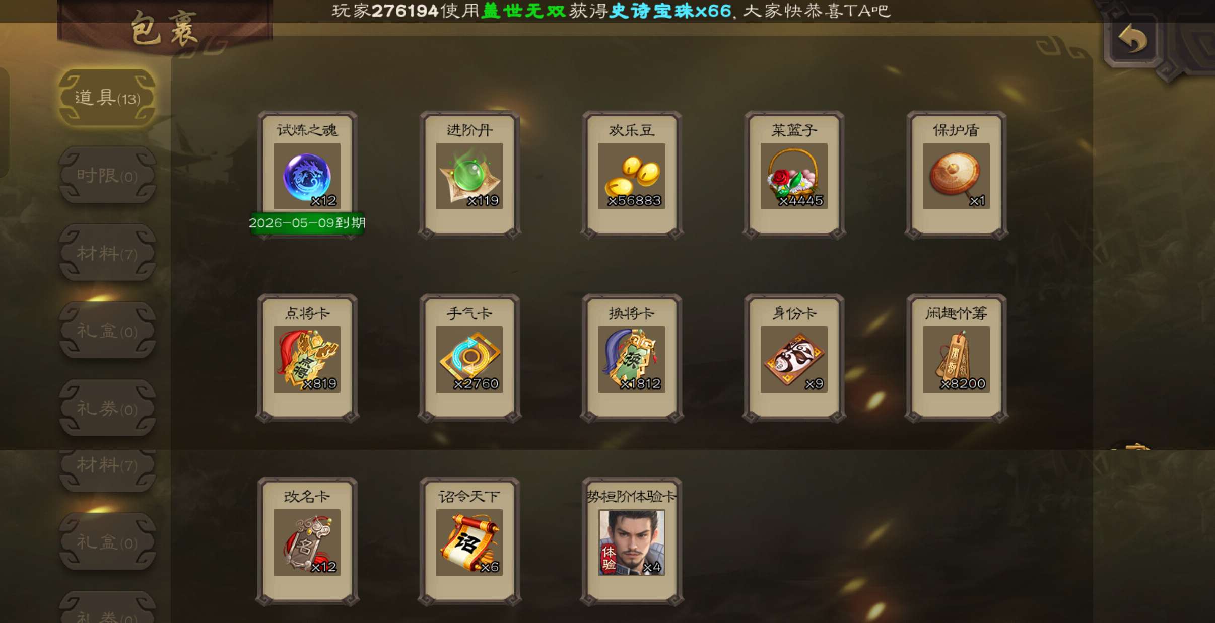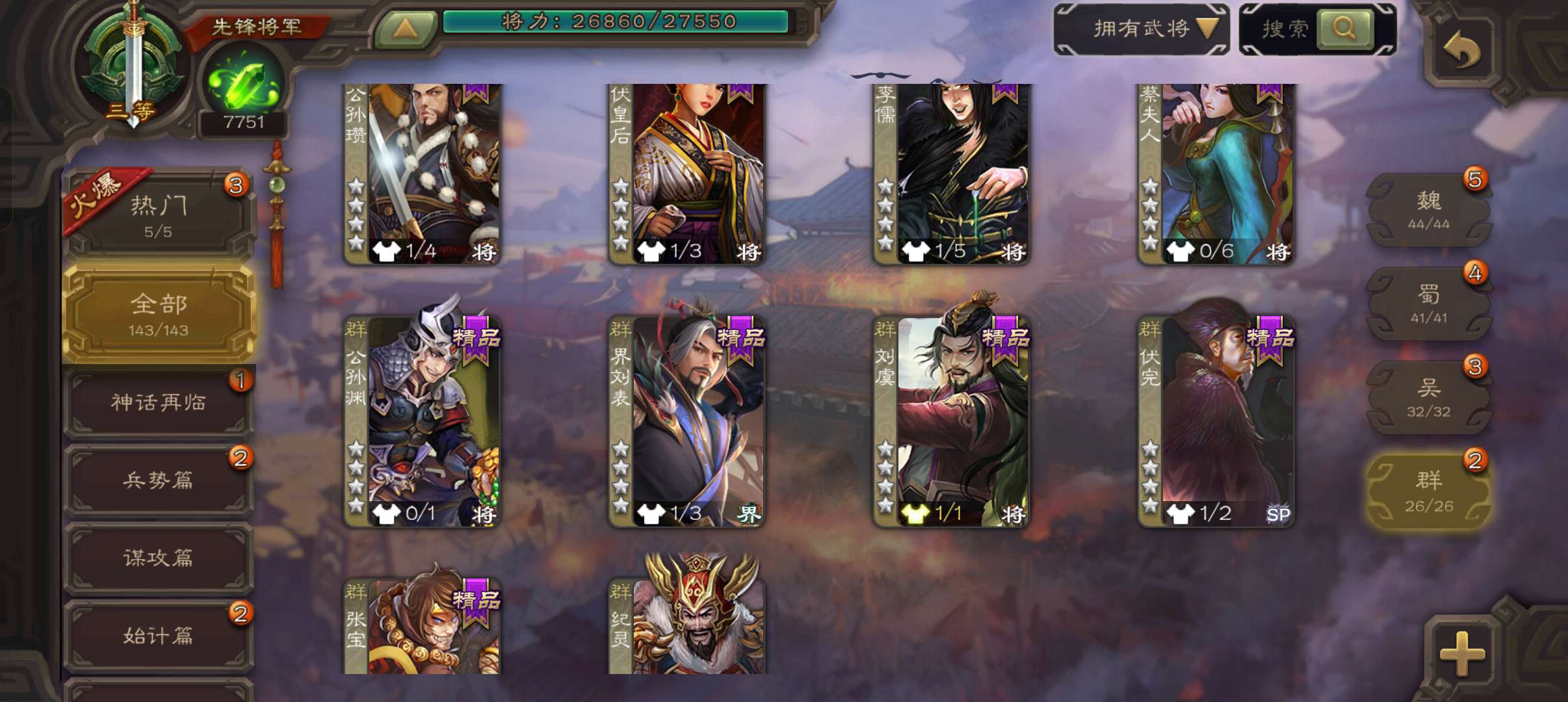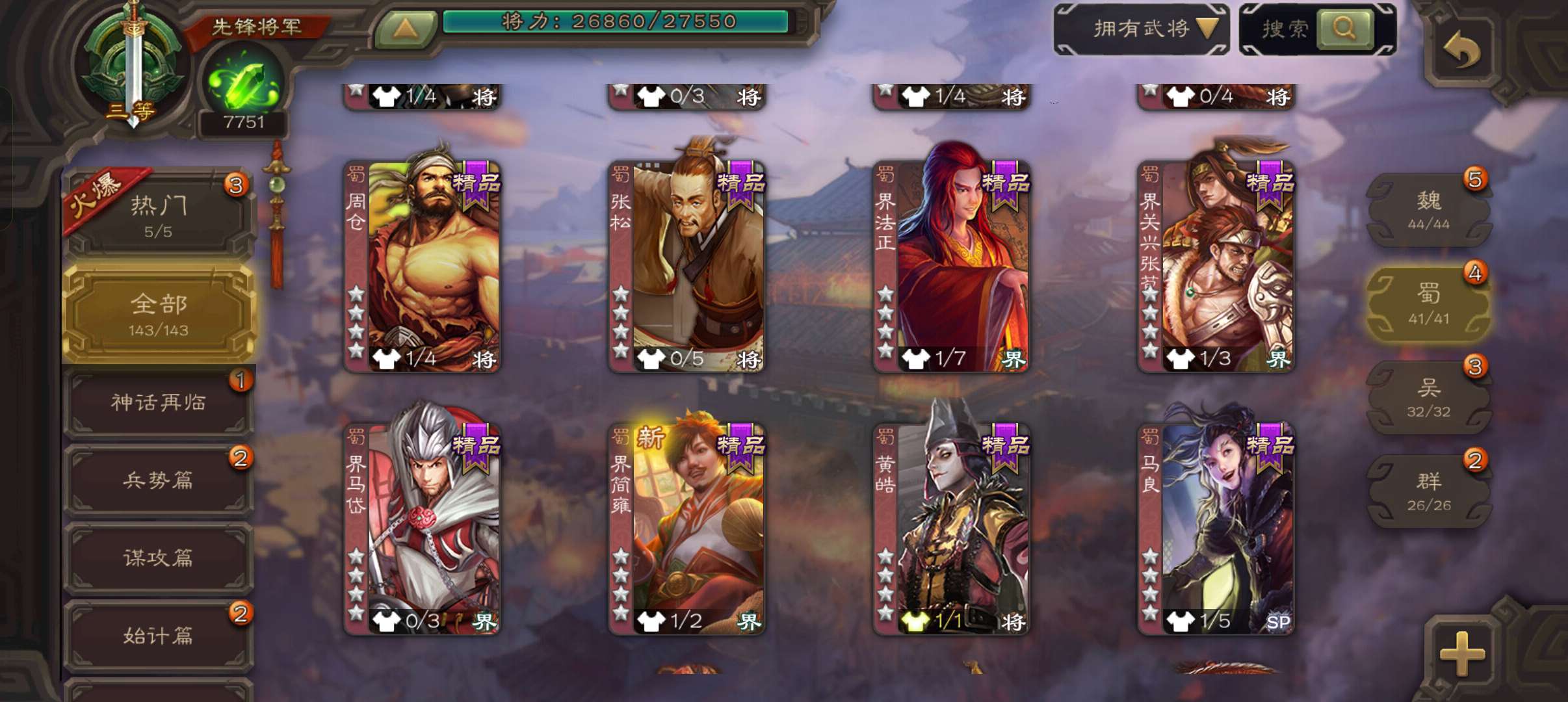 7700将魂7.9万羽毛,势太史慈界曹真张星彩董允4史诗先锋,关银屏骥李典谋韩当谋卢植143将