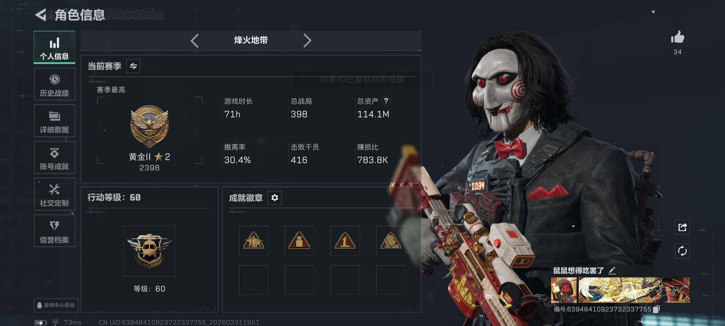 114m总资产-137k哈夫币-60烽火等级-黄金-50战场等级-将军
