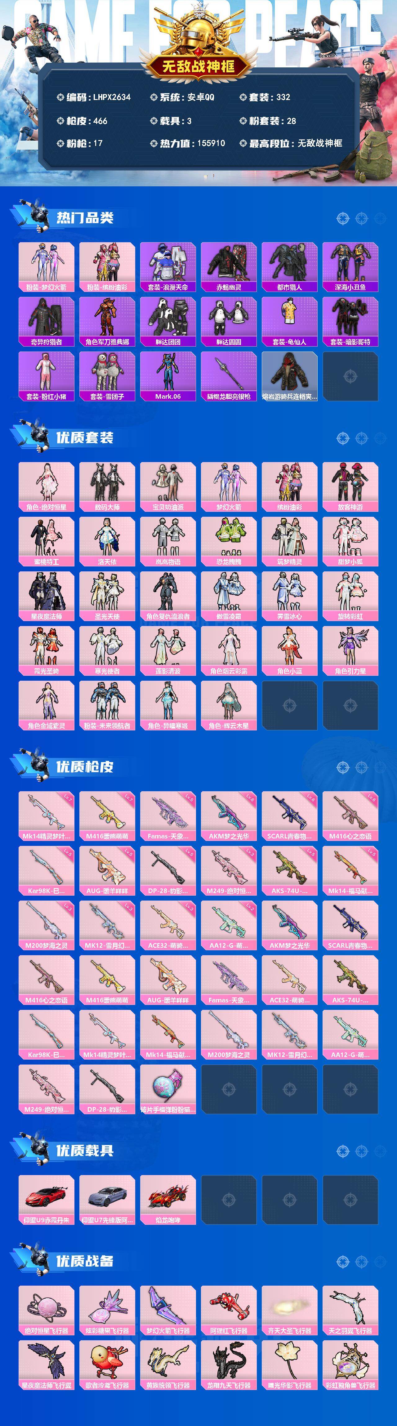 无敌战神框1【特价出售/店主推荐--热门套装新101洛天依赤蝎都市哥特】安卓 手Q-无敌战神框-28粉装-17特效枪-3载具-14粉色飞行器-155910热力值-21王牌印记-332套装-466枪皮【热门品类】:粉装-梦幻火箭,粉装-缤纷油彩,套装-浪漫天命,套装-赤蝎幽灵,套装-都市猎人,套装-深海小丑鱼,套装-奇异狩猎者,角色-军刀雅典娜,套装-胖达团团,套装-胖达圆圆,套装-龟仙人,套装-