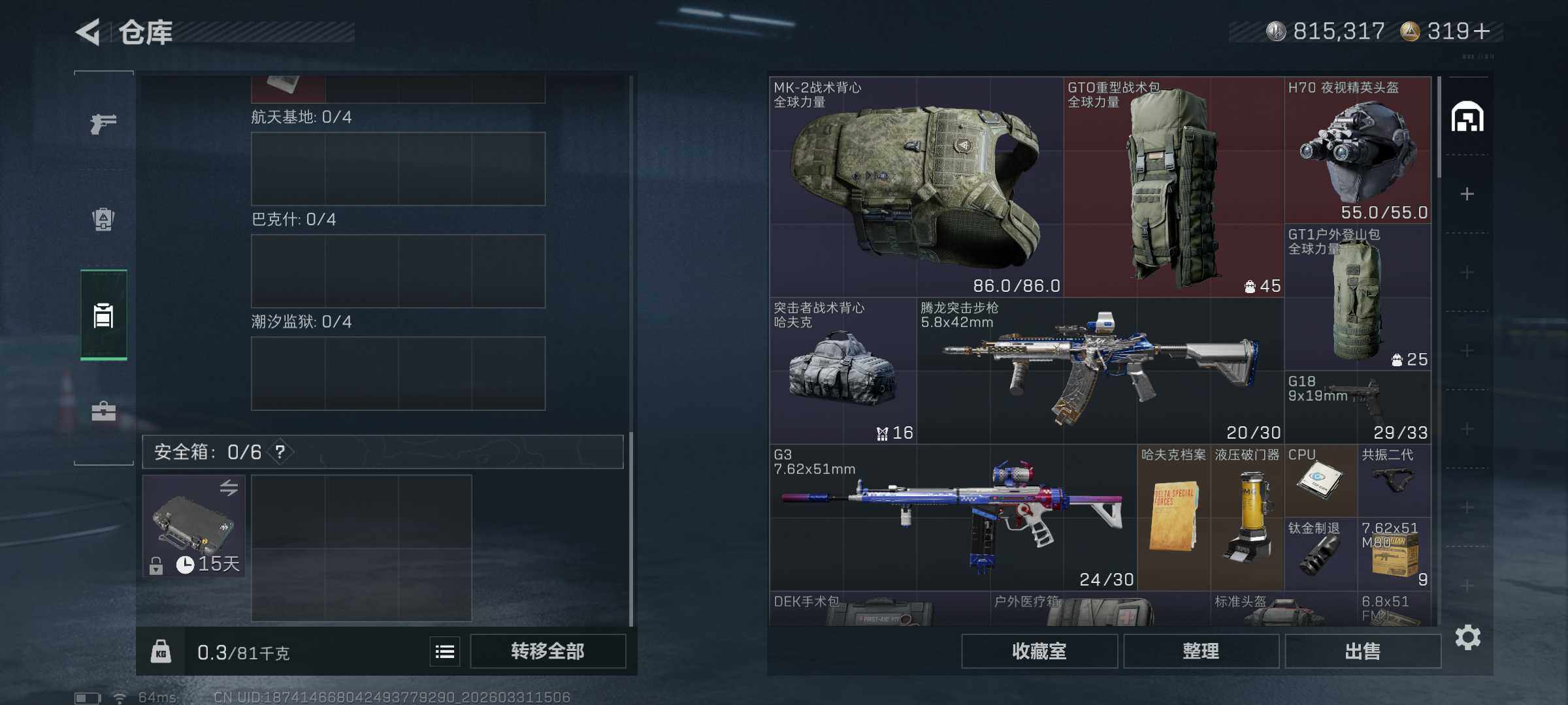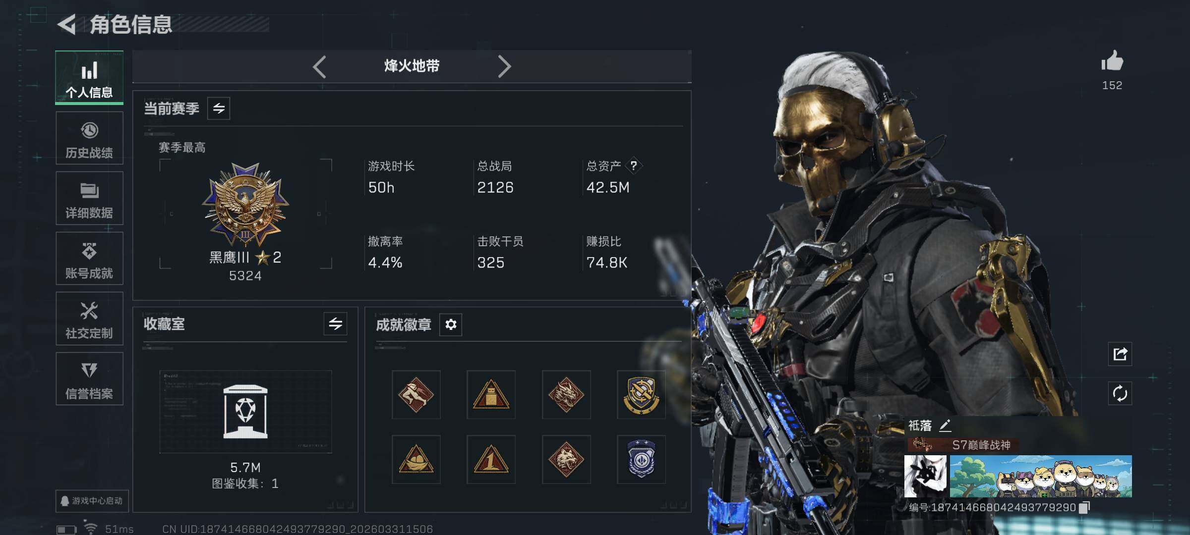 【sjs10339】可二次 玩够能回血 两红皮 两刀皮带北极星 烽火地带段位: 黑鹰 全面战场段位: 上等兵 总资产: 41000000 哈夫币: 815000 sjs10339 干员外观: 红狼-蚀金玫瑰,蜂医-送葬人·无题密令(S5),露娜-黑·天际线,深蓝-不破誓约(S6),红狼-电锯惊魂,露娜-金牌射手(S7),乌鲁鲁-荒原猎手 传说武器皮肤: M4A1突击步枪-蚀金玫瑰,SR-25射手步枪-水墨云图,SMG45冲锋枪-骑士,近战-北极星,K437突击步枪-北极星,725双管霰弹枪