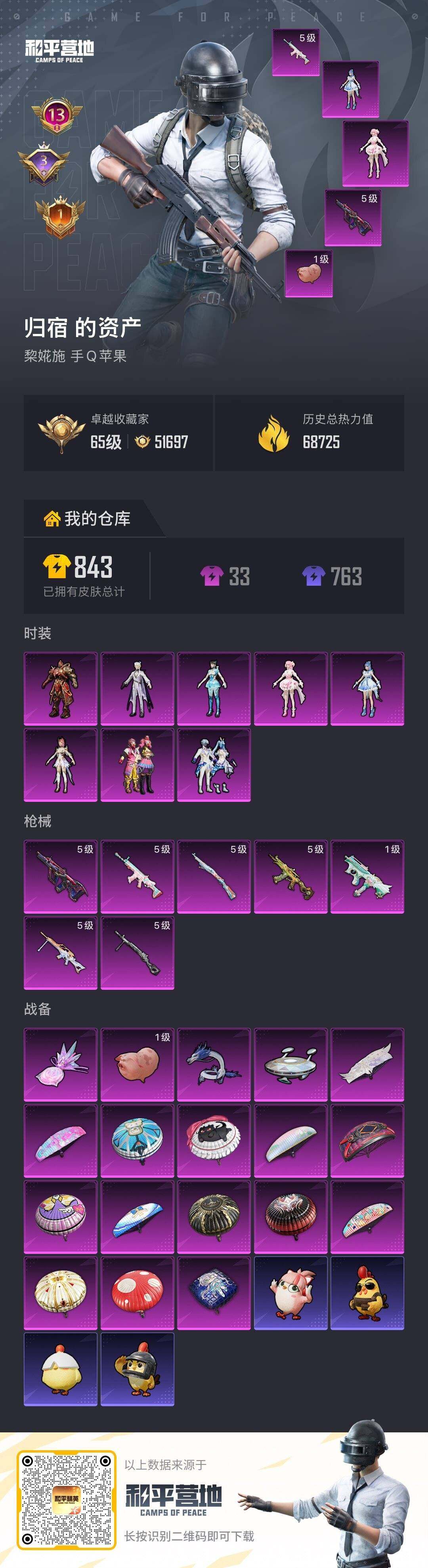 【和平精英连体王者荣耀】实名: 可修改 时装数: 707 枪械数: 220 战备数: 166 热门装扮: 深海小丑鱼,万圣娃娃,迅捷狂鲨,鹰眼刺客,缤纷油彩,胖达圆圆,神秘黑猫,未来歌姬,圣堂之誓,星渊,异瞳寒姬,虎痴许褚 稀有枪皮:SCAR-L-锦绣绵绵(五级),AUG-星之彼岸(五级),AKS-74U-森灵之息(五级),JS9-奇迹舞步(一级),Kar98K-巳巳如意(五级),DP-28-豹
