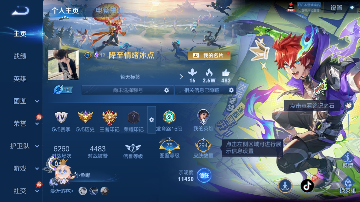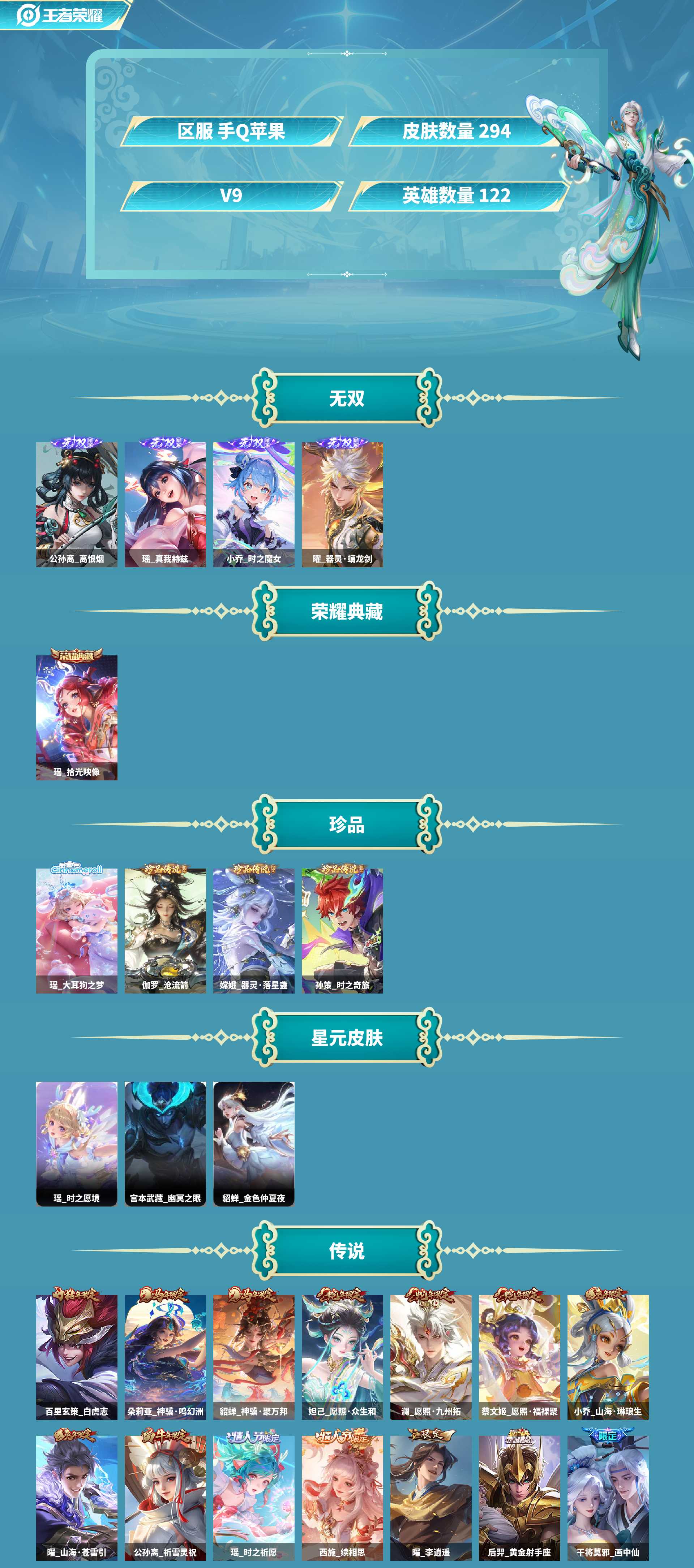 妹妹号!瑶全皮!4无双!瑶典藏!皮肤数量294印记总数8V9
