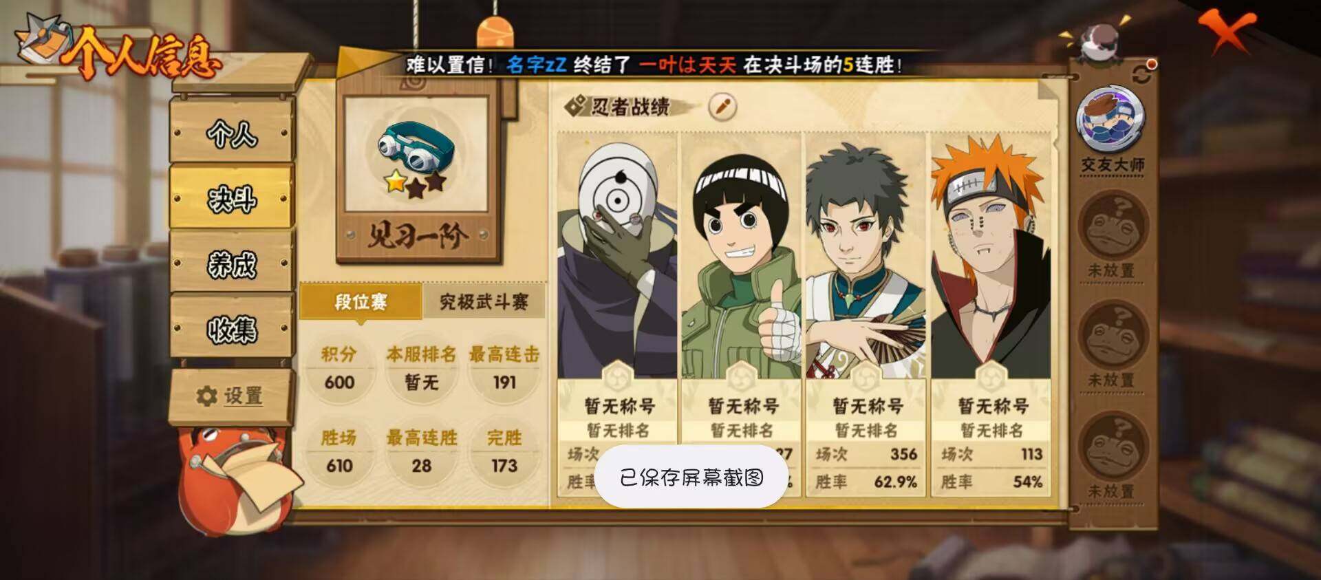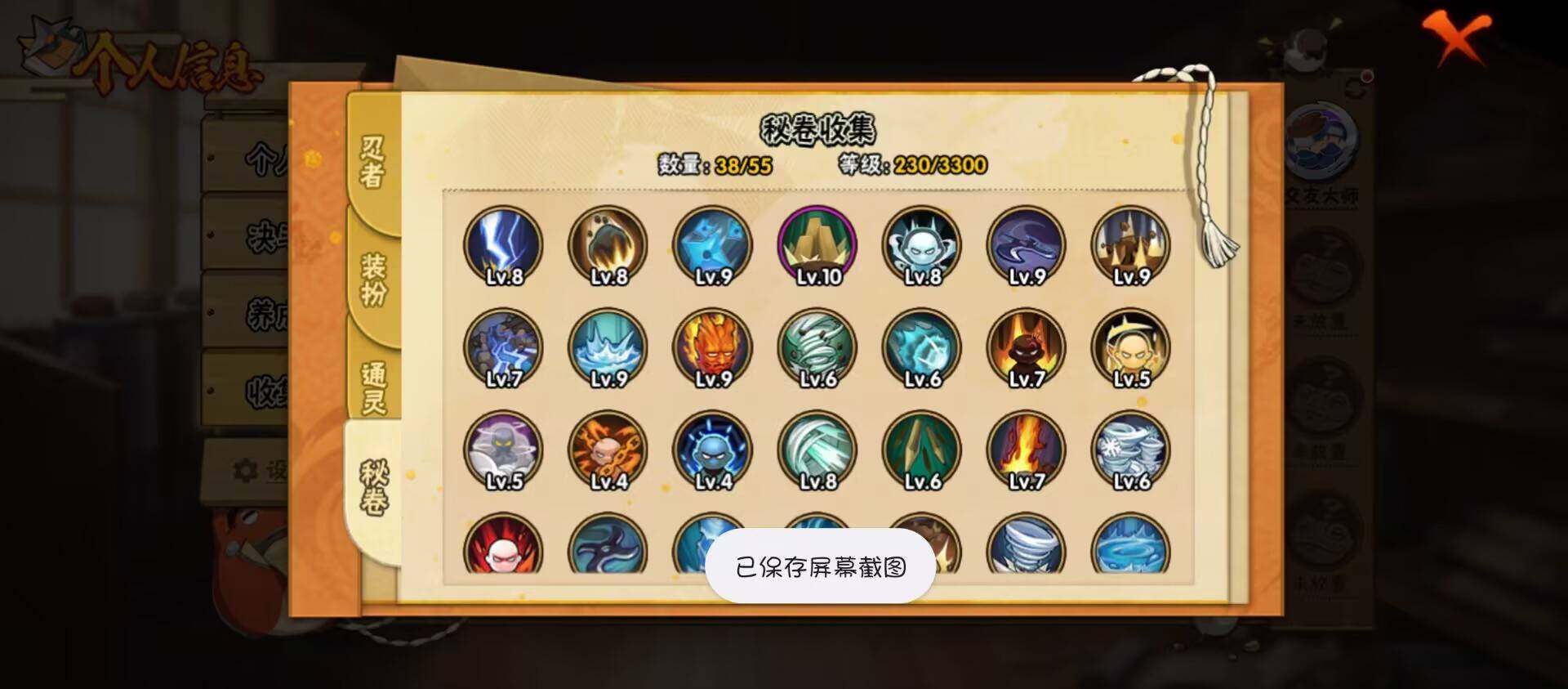 【A级忍者】:三船「青年」(2星),迪达拉(2星),大蛇丸「晓」(2星),迈特凯(2星),蝎(2星),宇智波止水「新春限定」(2星),宇智波鼬(2星),李洛克「忍界大战」(2星)