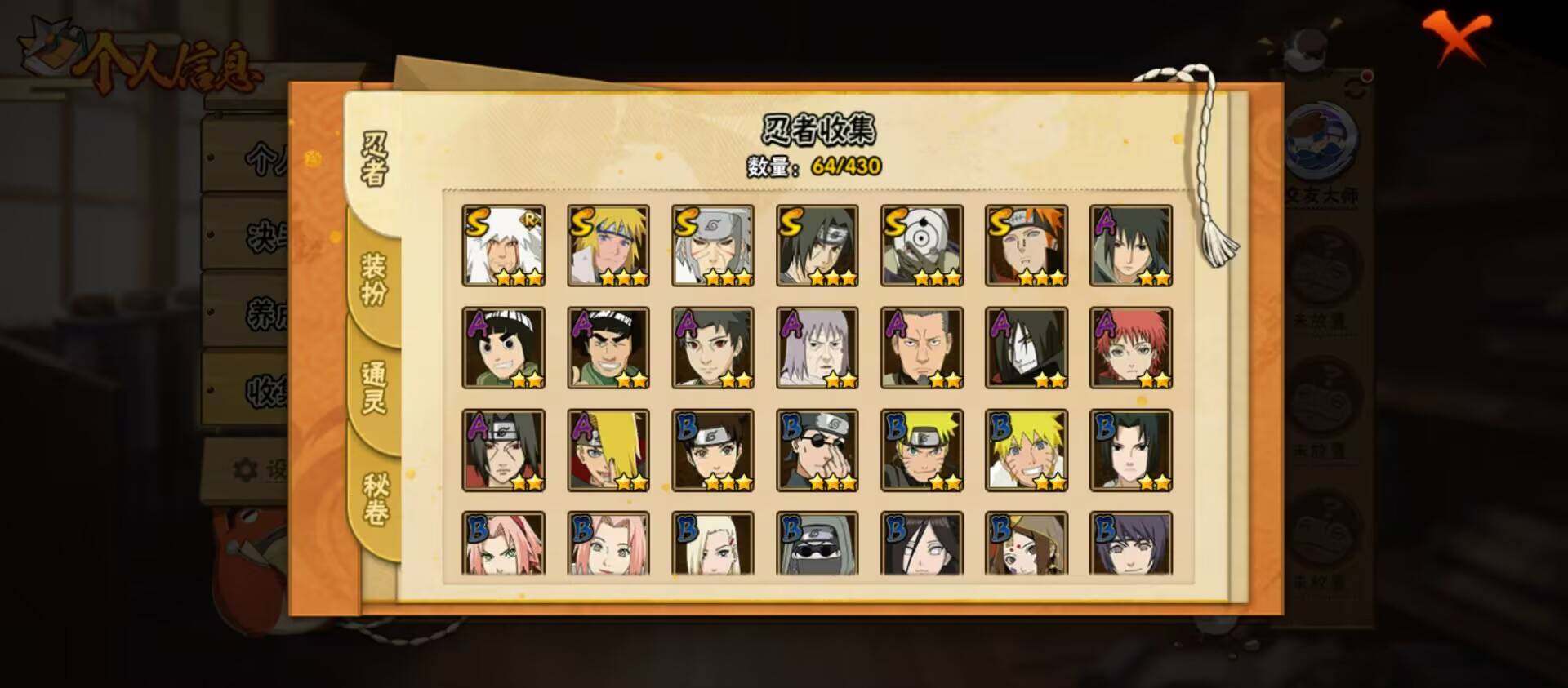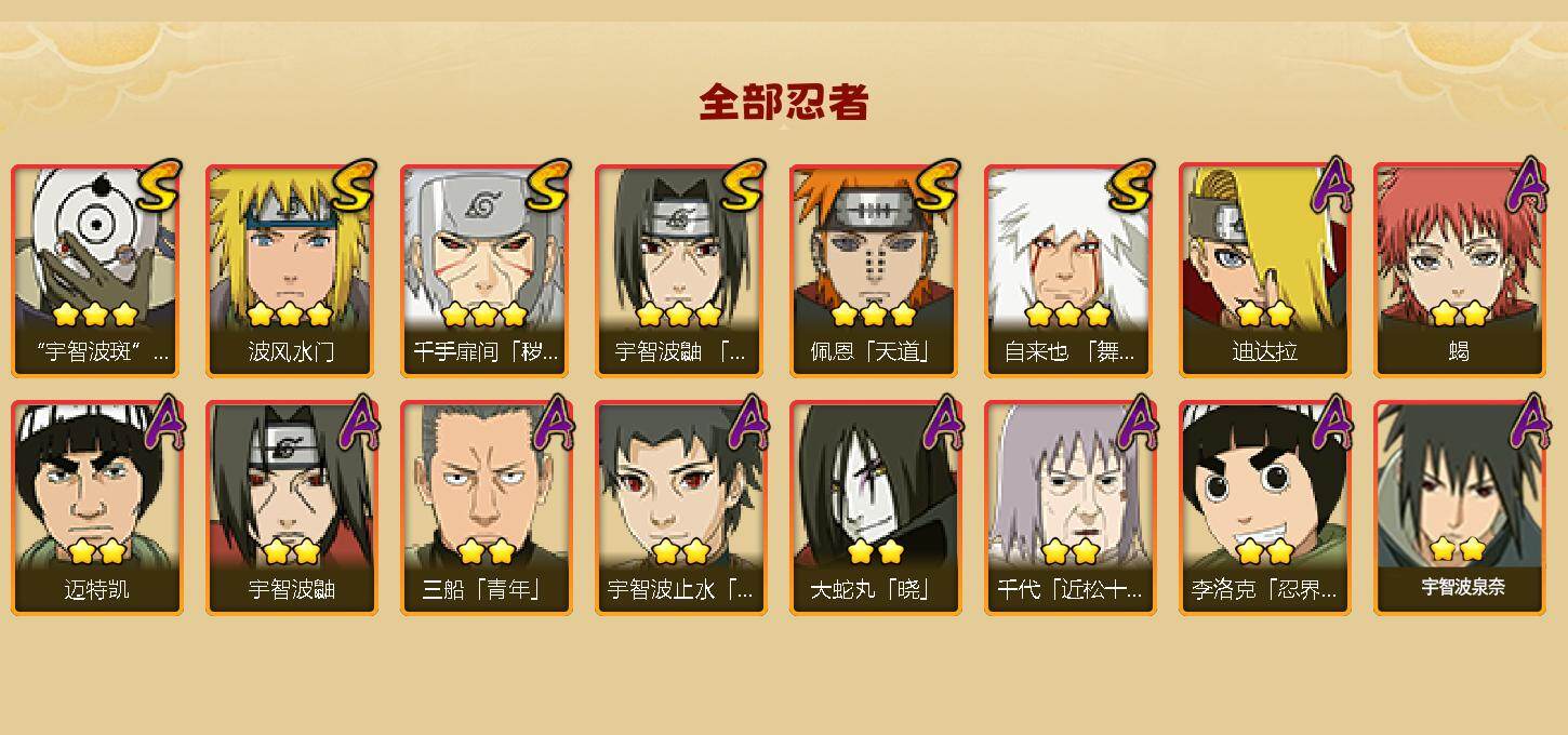 【S级忍者】:千手扉间「秽土转生」(3星),宇智波鼬「须佐能乎」(3星),自来也「舞之豪杰」(3星),波风水门(3星),佩恩「天道」(3星),宇智波斑 「白面具」(3星宇智波斑「白面具」)