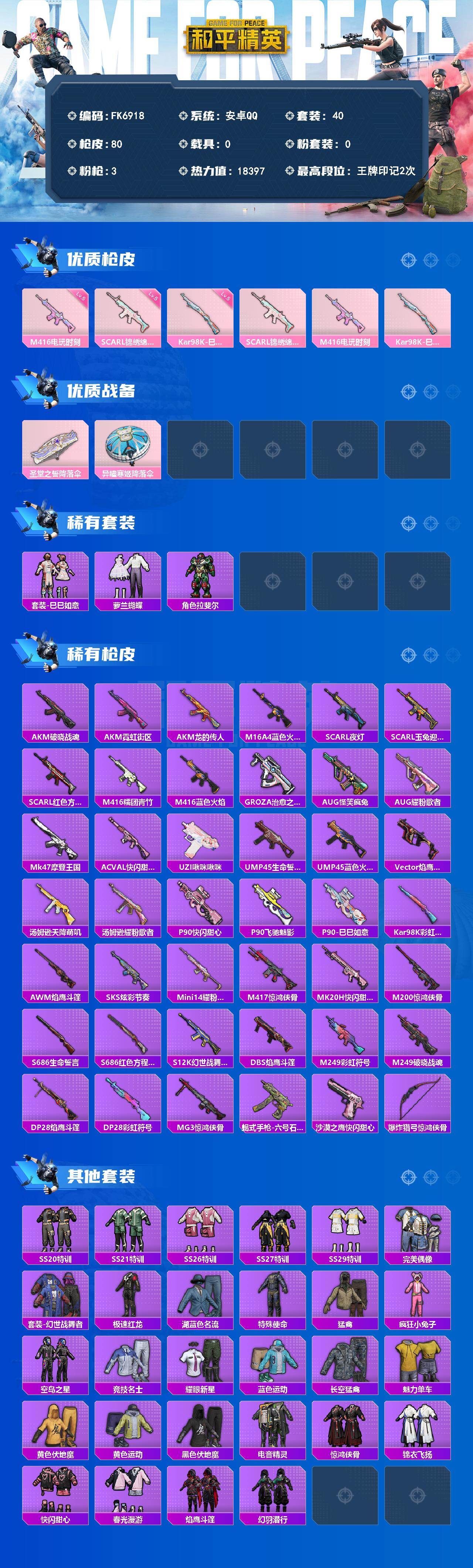 【FK6918】40套装/枪械3/装备74/战备44/王牌印记2/热力值18397/五级SCAR-L-锦绣绵绵/五级M416-电玩时刻/五级Kar98K-巳巳如意/SCAR-L-锦绣绵绵/M416-电玩时刻/Kar98K-巳巳如意/圣堂之誓降落伞/异瞳寒姬降落伞/巳巳如意/萝兰蝴蝶/角色-拉斐尔/AKM-破晓战魂/AKM-霓虹街区/AKM-龙的传人/M16A4-蓝色火焰/SCAR-L-夜灯/SC