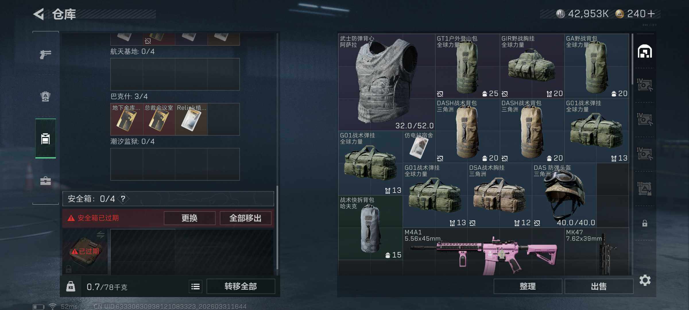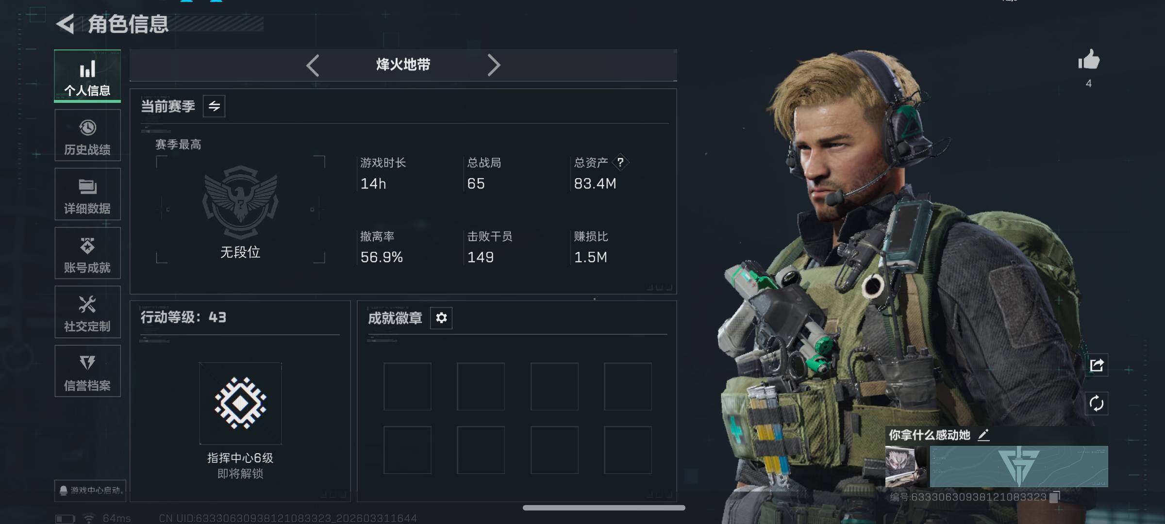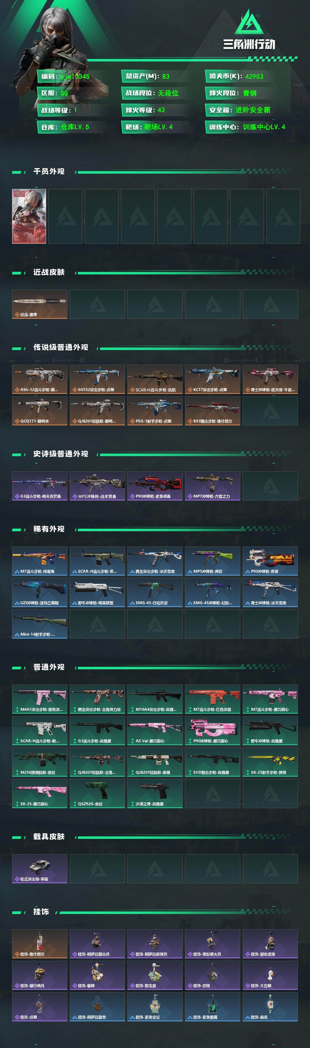 83m总资产-42953k哈夫币-43烽火等级-青铜-1战场等级-无军衔