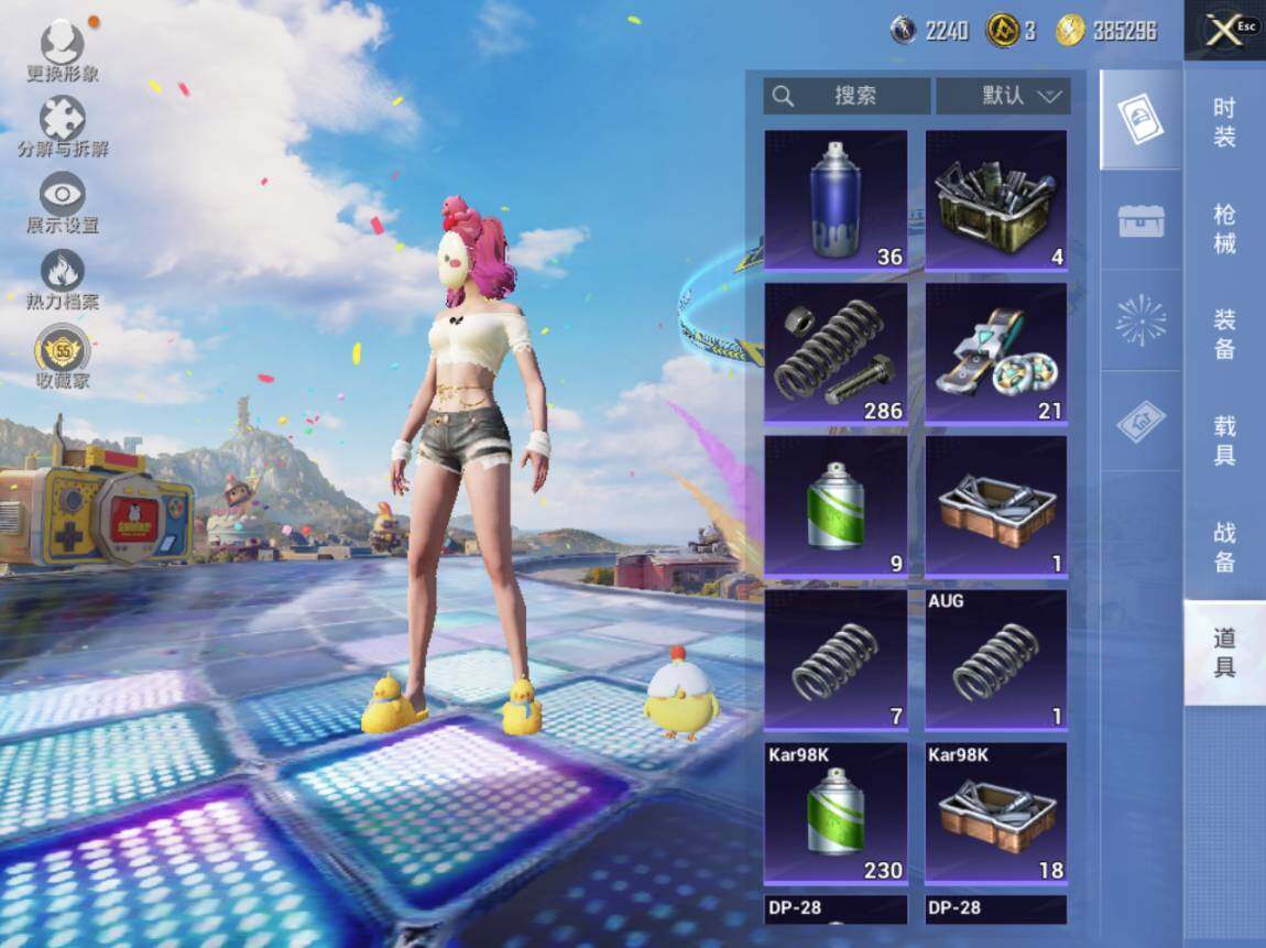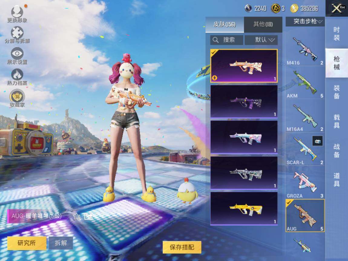 【粉色枪皮等级】:AUG-暖羊咩咩(五级),UMP45-量子极限(五级),Kar98K-巳巳如意(五级),DP-28-豹影疾电(五级),PKM-萌骑夺宝(五级)