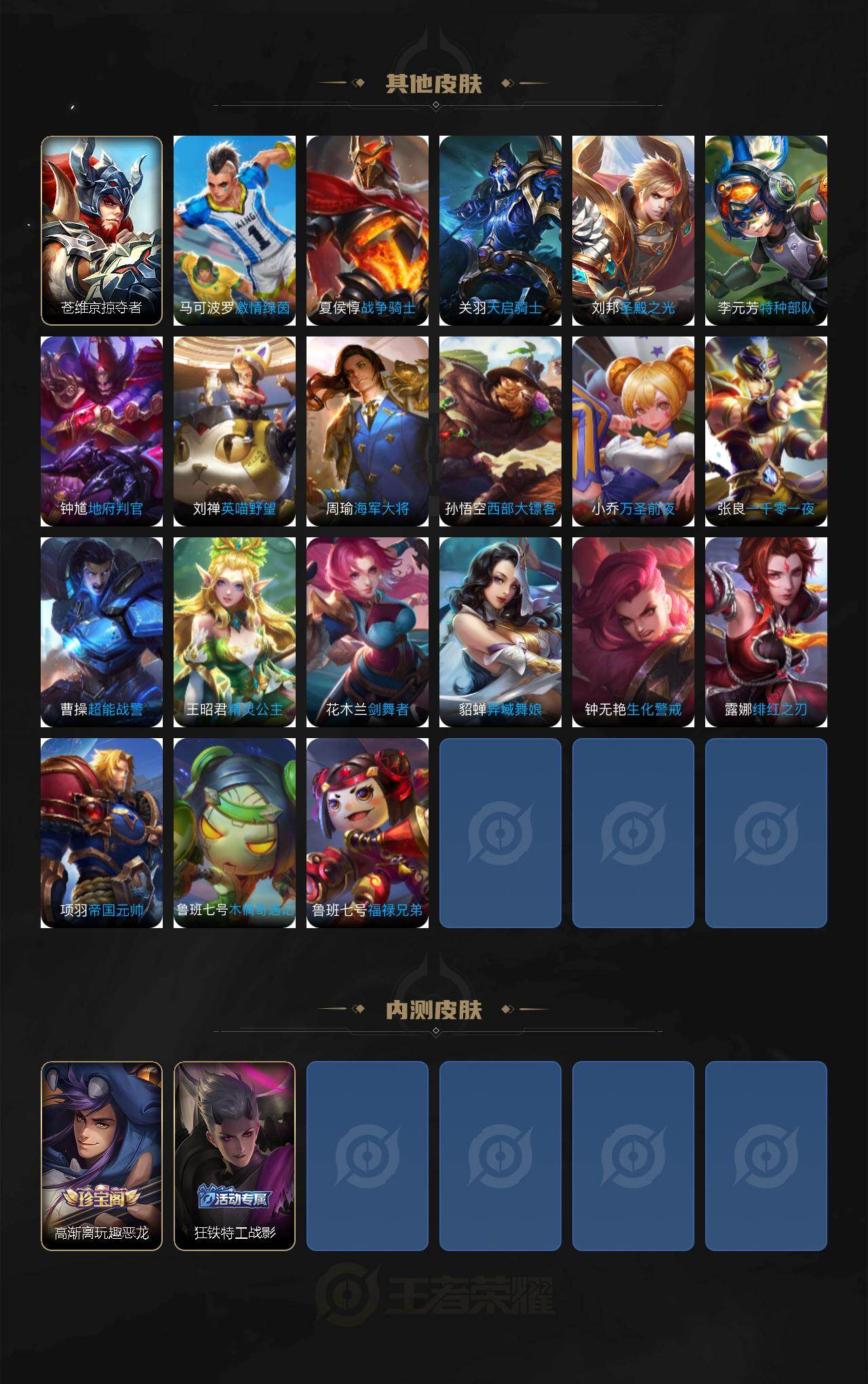 【传说皮肤】:马超神骥逐星野,后羿神树通天,司空震愿照山河定,澜愿照九州拓,云缨幻光神枪,孙