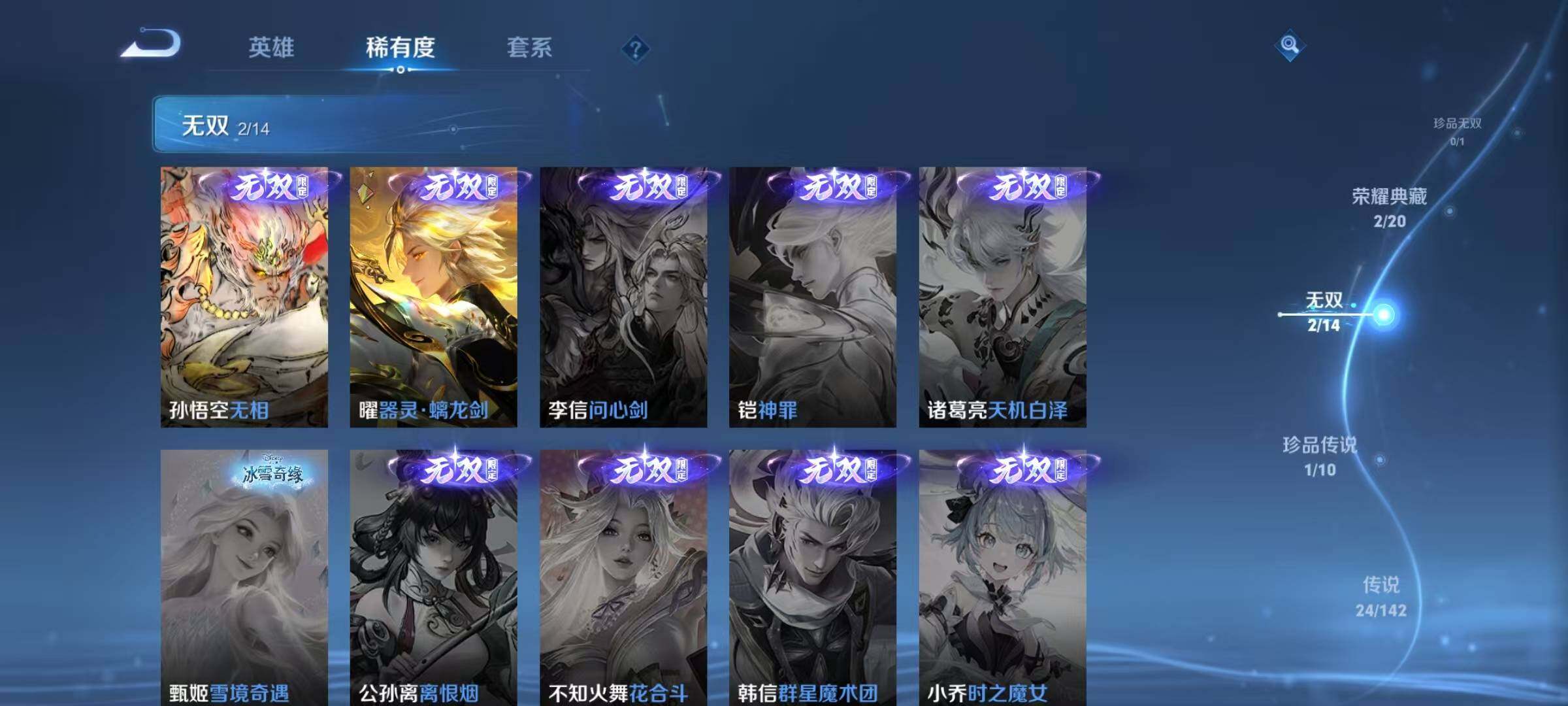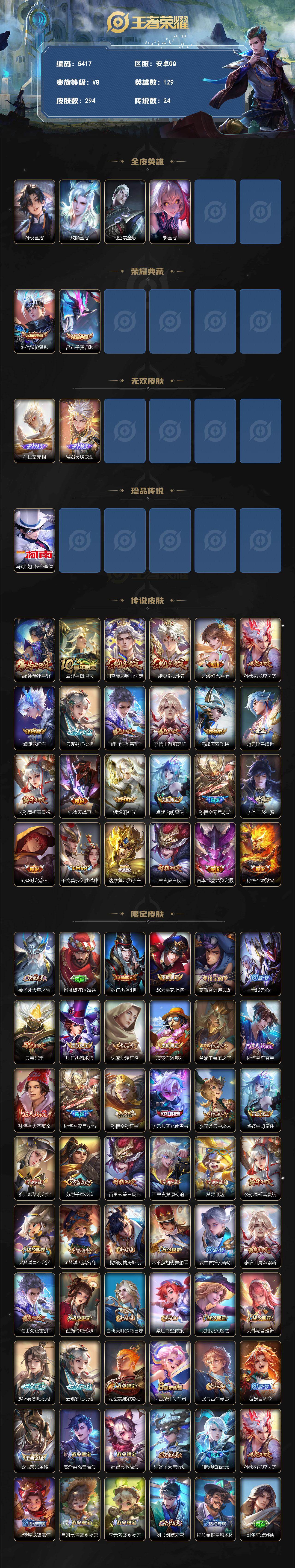/安卓Q-V8-至尊星耀V段位-129英雄-294皮肤-2典藏皮肤-2无双-1珍品传说-24传说-86史诗