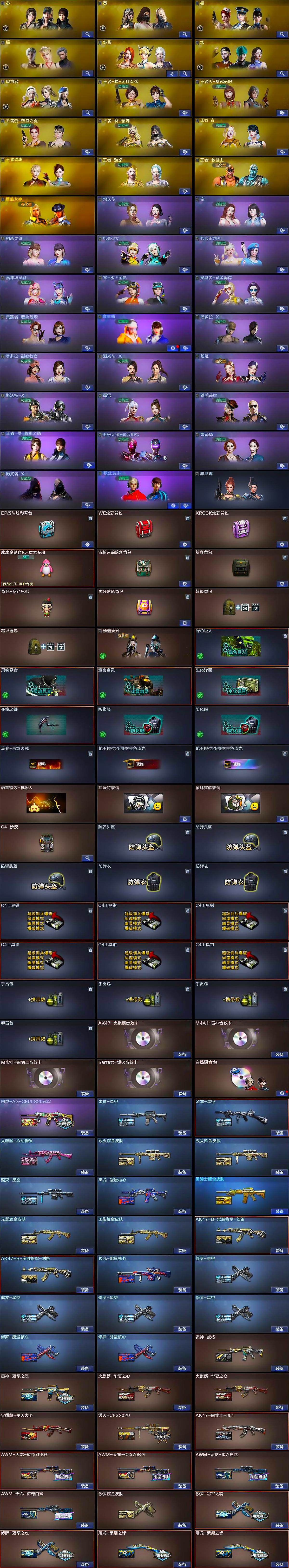 【热门武器】:QBZ03-金色蔷薇*2,Scar Light-白虎,Kar98K-星神,M4A1-黑骑士*2,汤姆逊-烈龙*4,RPK-盘龙*8,加特林-炼狱*5,COP-白鲨,沙鹰-修罗*10,金刚伞