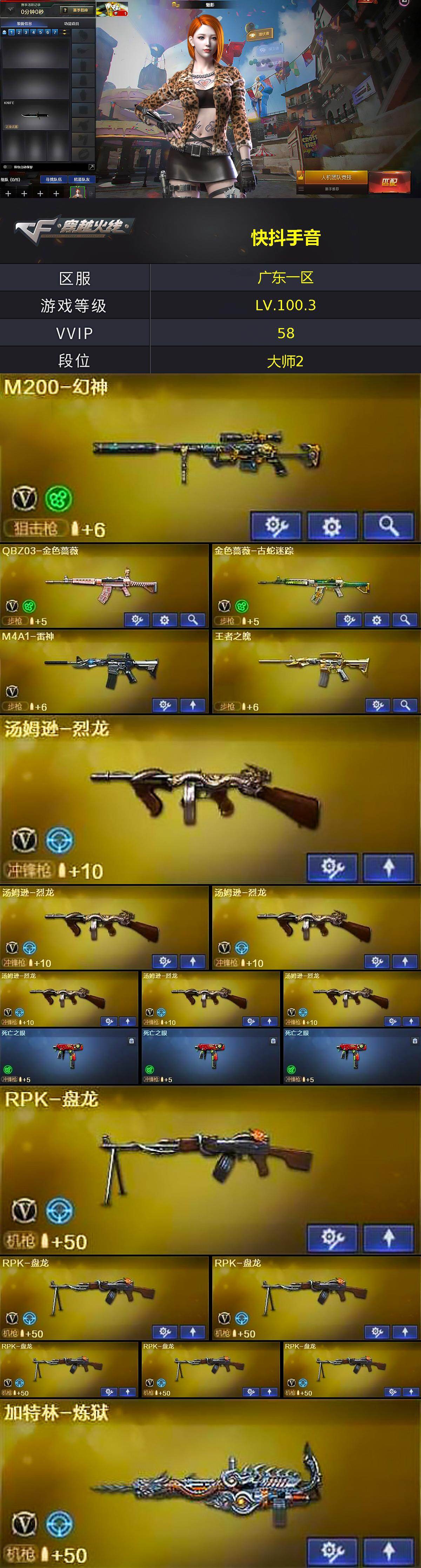 【热门武器】:QBZ03-金色蔷薇,HK417-朱雀,M200-幻神,金色蔷薇-古蛇迷踪,修罗-古蛇迷踪,死亡之眼*3,M4A1-黑骑士*6,汤姆逊-烈龙*6,RPK-盘龙*6,加特林-炼狱,火麒麟-绝迹,沙鹰-修罗*5