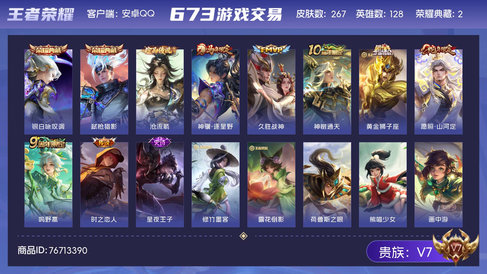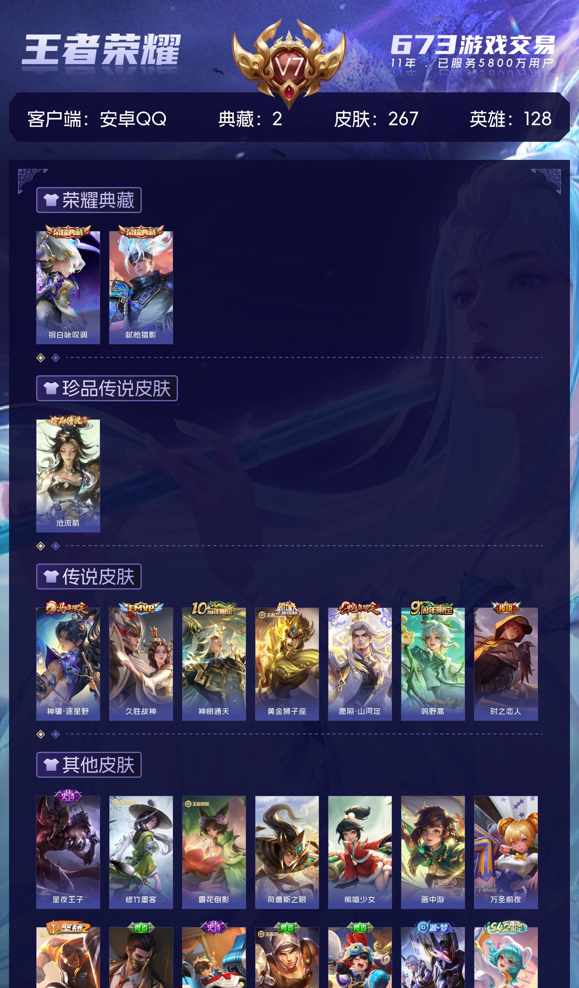 V7 皮肤267 英雄128 永恒钻石 荣耀典藏2 珍品传说1 传说7