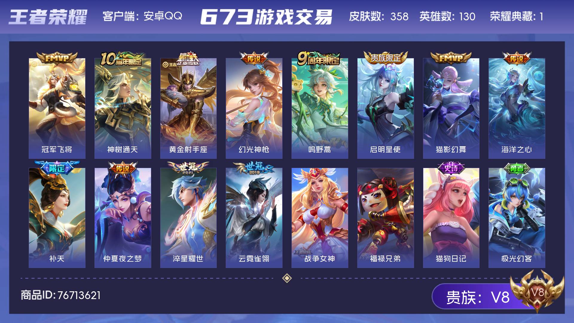 V8 皮肤358 英雄130 至尊星耀 荣耀典藏1 传说13