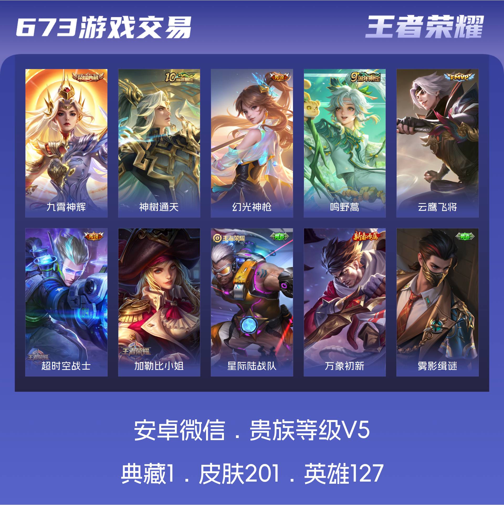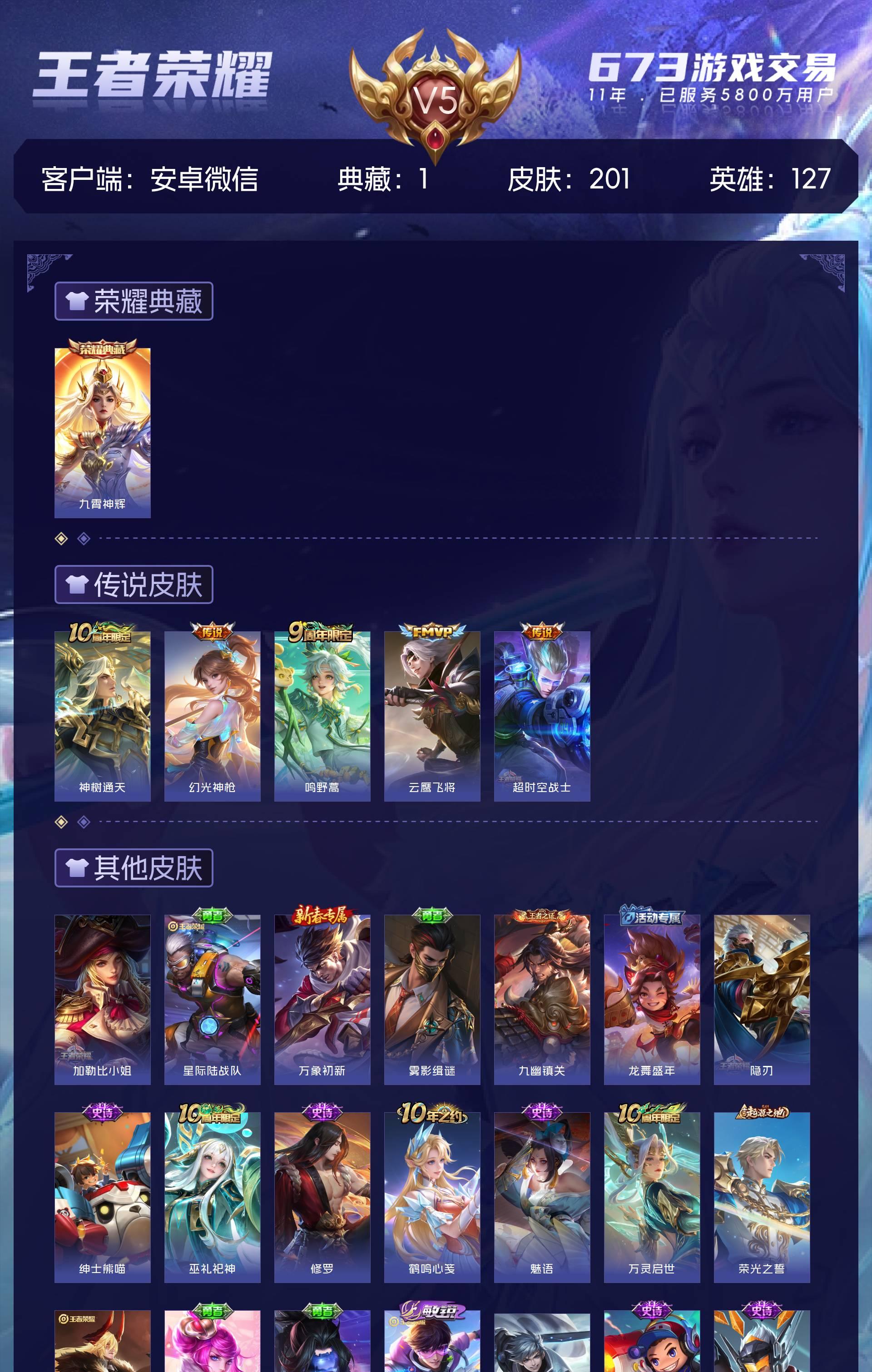 V5 皮肤201 英雄127 至尊星耀 荣耀典藏1 星传说1 传说5
