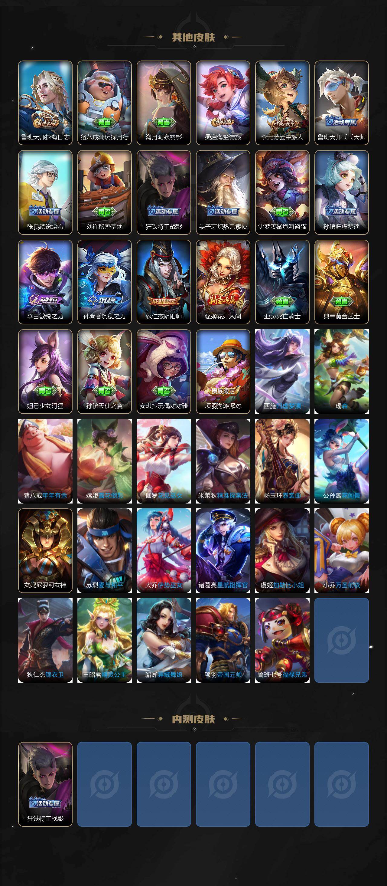 【限定皮肤】:蒙犽顽岩魄,姜子牙天穹之誓,狄仁杰阴阳师,项羽海滩派对,李元芳云中旅人,嫦娥拒霜思,鲁班大师探海日志,桑启海盐诗旅,张良古海寻踪,高渐离燃音魔法,妲己灵卜魔法,鬼谷子天穹祈灯,姬小满妄想食味,安琪拉乘龙聚宝船,貂蝉曦