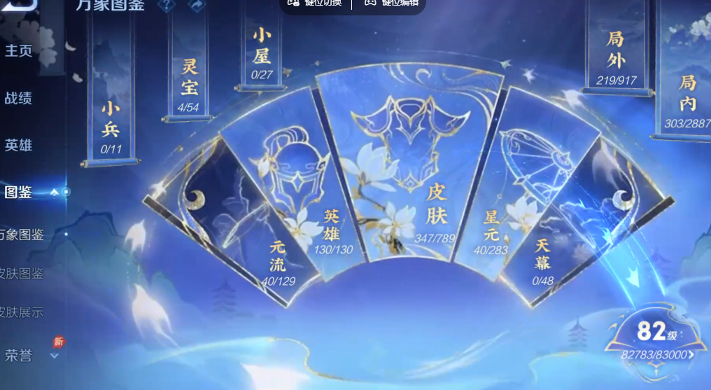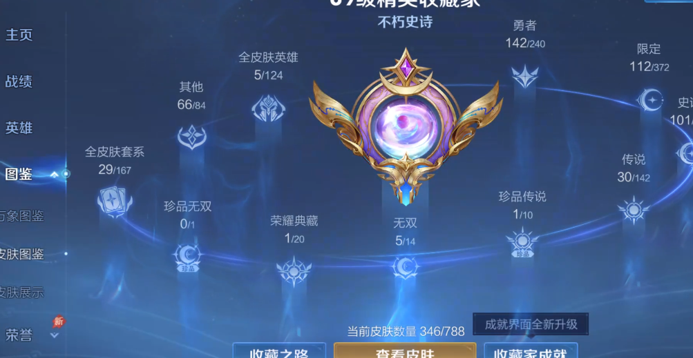 皮肤数347无双皮肤数5传说皮肤数30珍品传说皮数1星传说皮