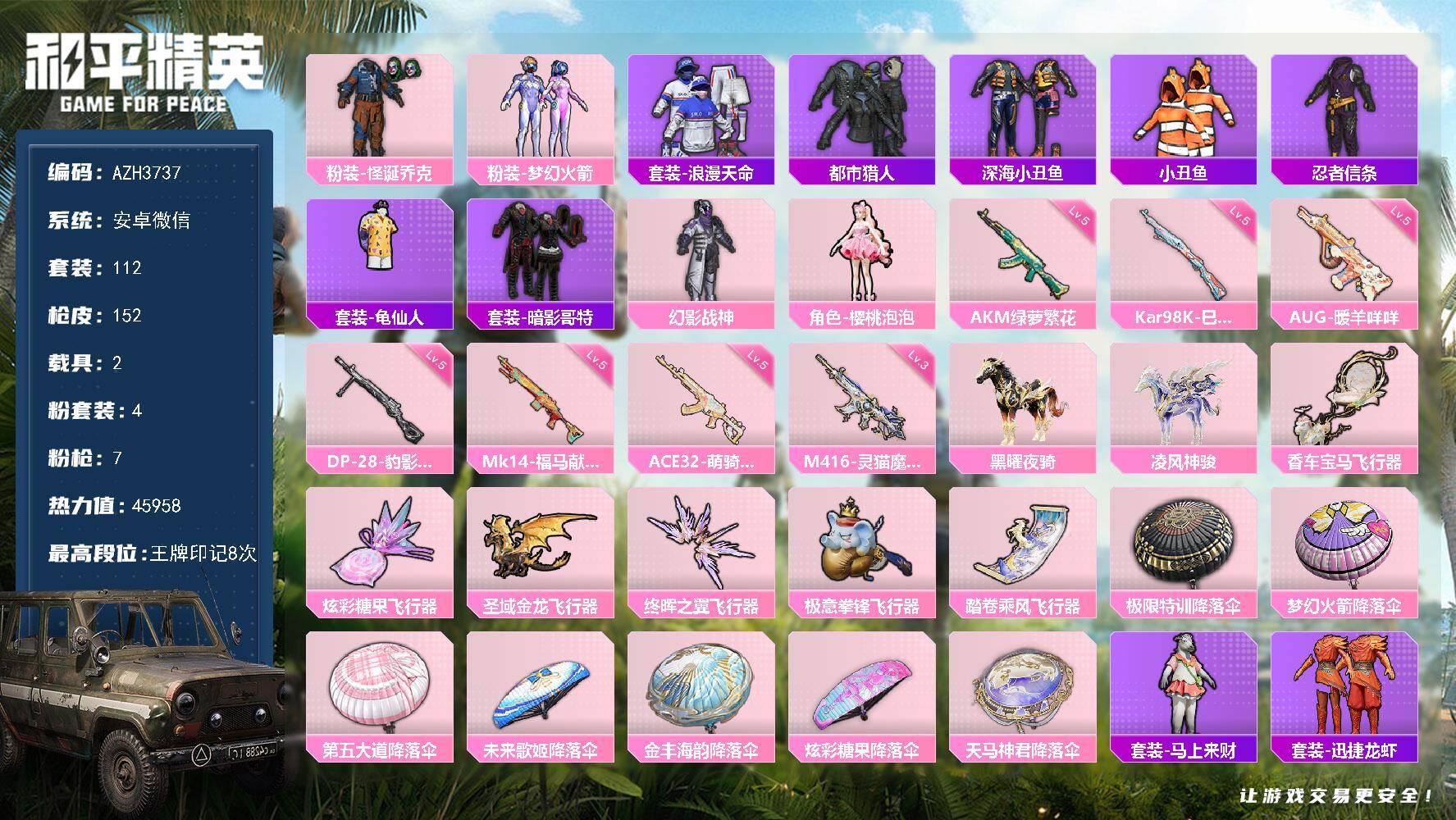 【AZH3737】安卓 微信【怪诞乔克都市幻影战神梦幻火箭 粉熊背包 2载具】4粉装-7特效枪-2载具-8粉色飞行器-45958热力值-8王牌印记-112套装-152枪皮