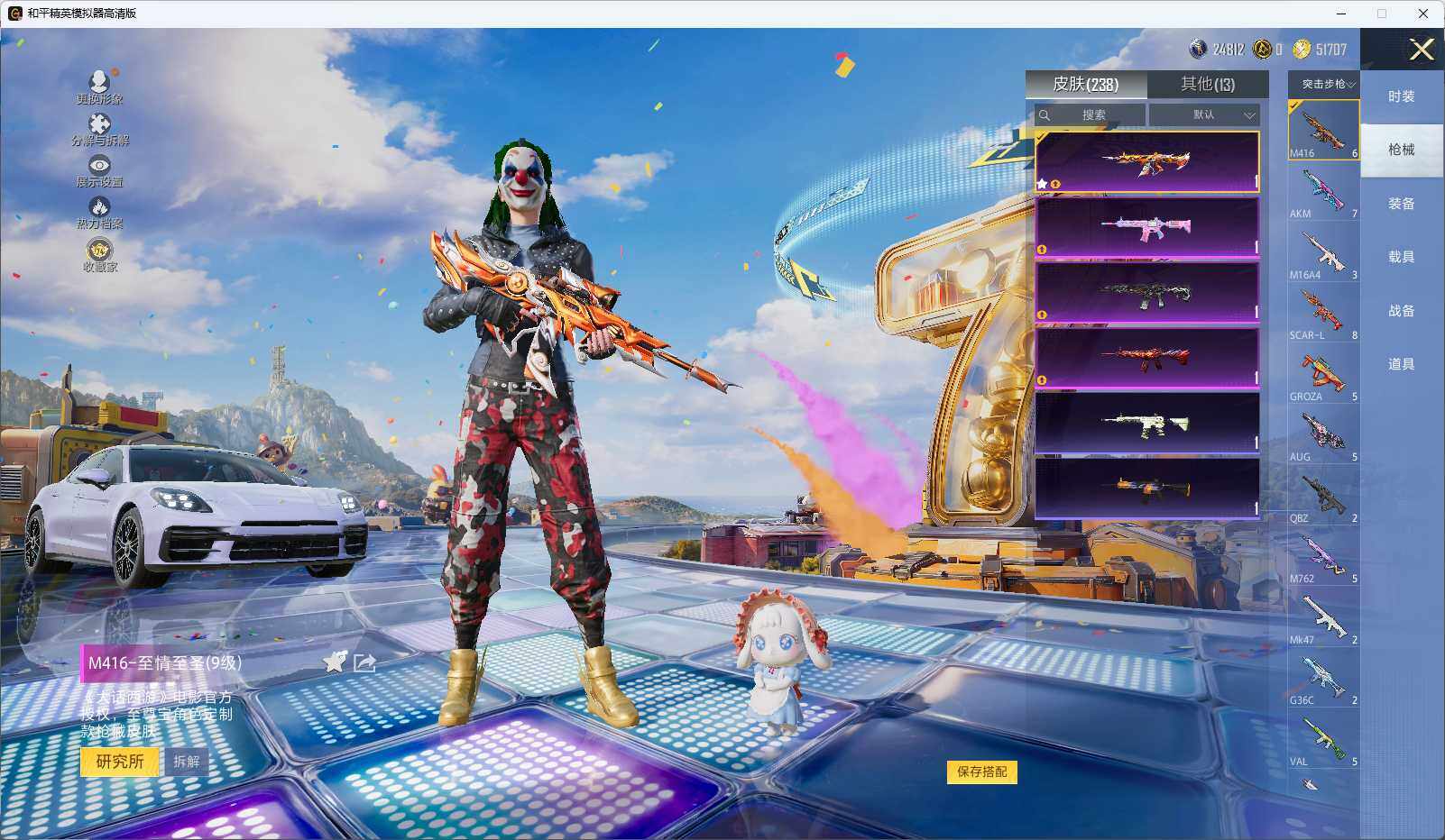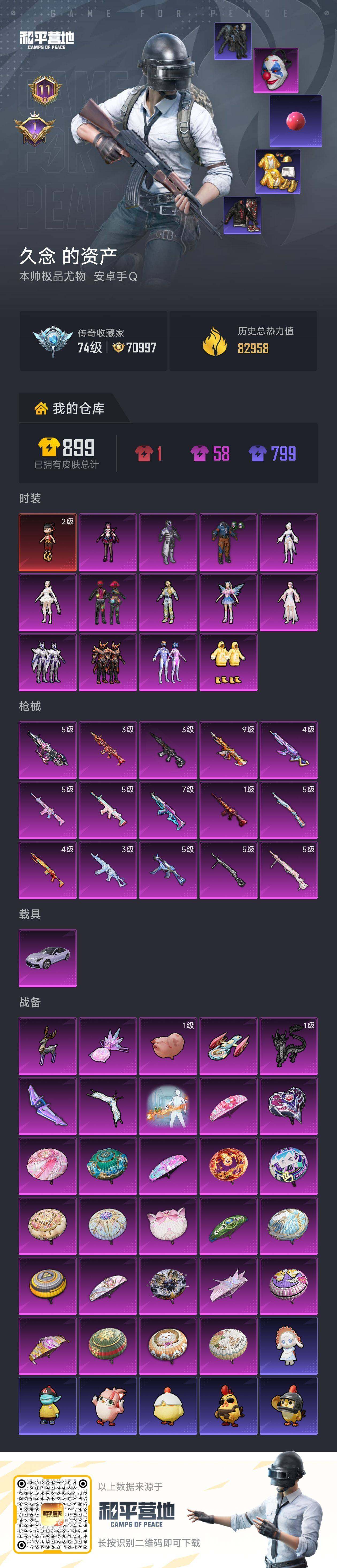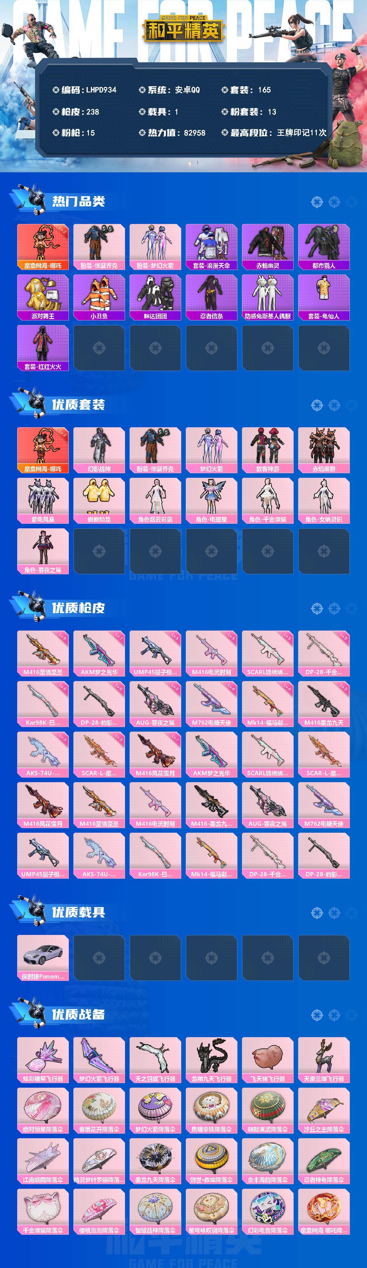 【极品身法套/都市/金鞋/赤蝎/新101/怪诞乔克/魔童闹海/M416-至情至圣(九级)/集结仓玉虚云仓】安卓 手Q-1神装-13粉装-15特效枪-1载具-7粉色飞行器-82958热力值-11王牌印记-165套装-238枪皮