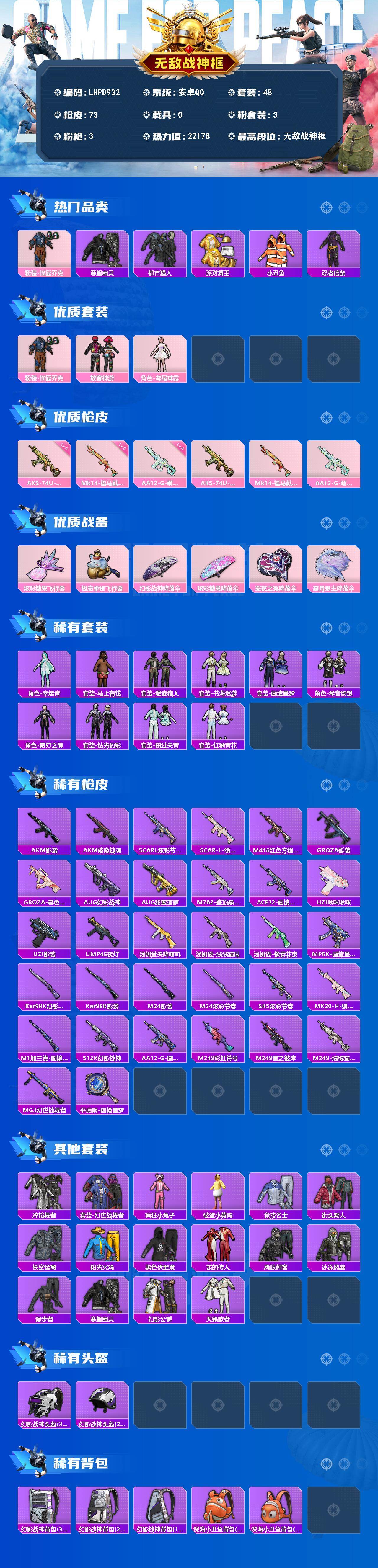 【极品男神套/都市/金鞋/寒蝎/怪诞乔克/小丑鼻子/无敌战神框/满级地铁天赋】安卓 手Q-无敌战神框-3粉装-3特效枪-0载具-2粉色飞行器-22178热力值-4王牌印记-48套装-73枪皮