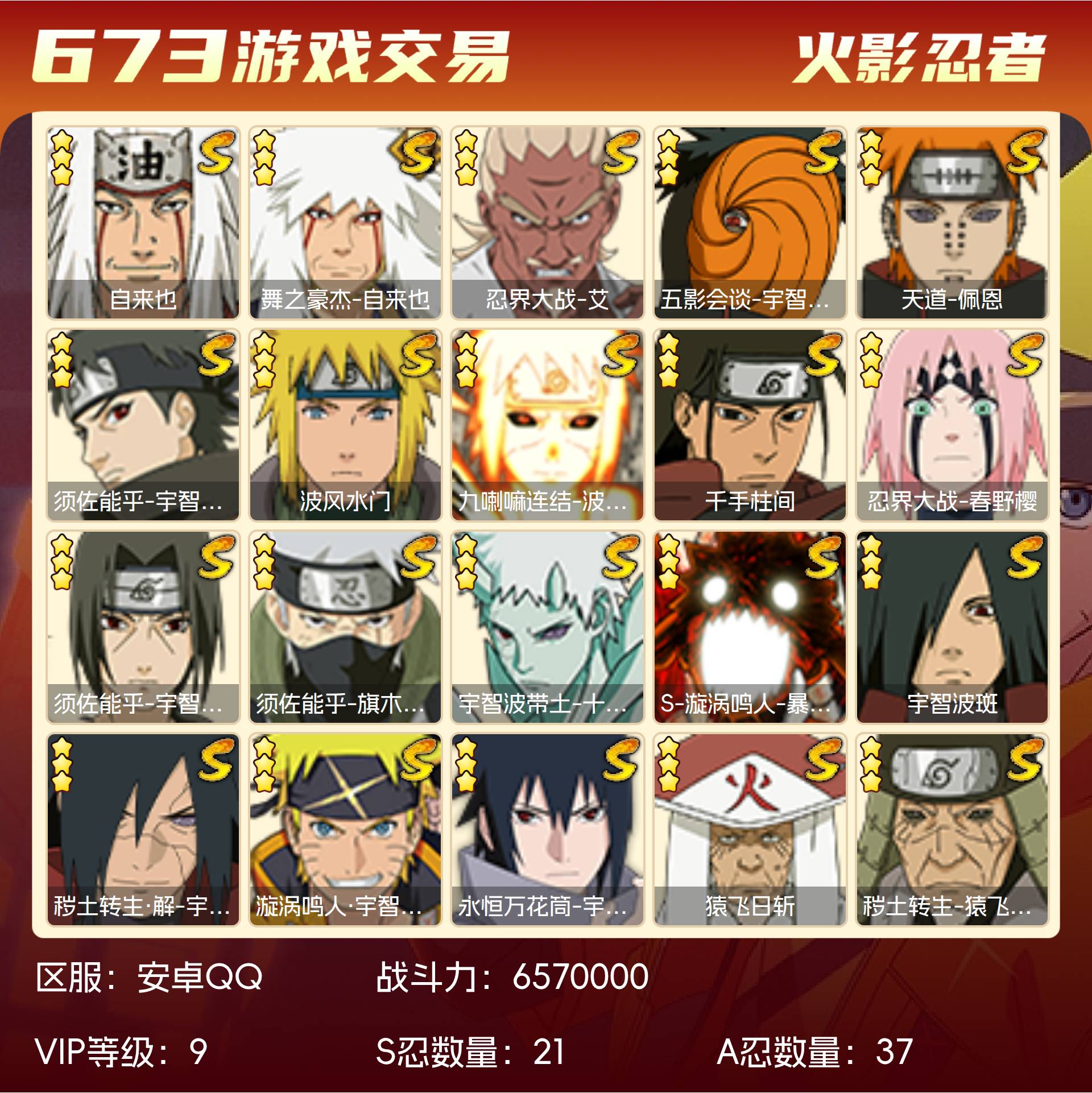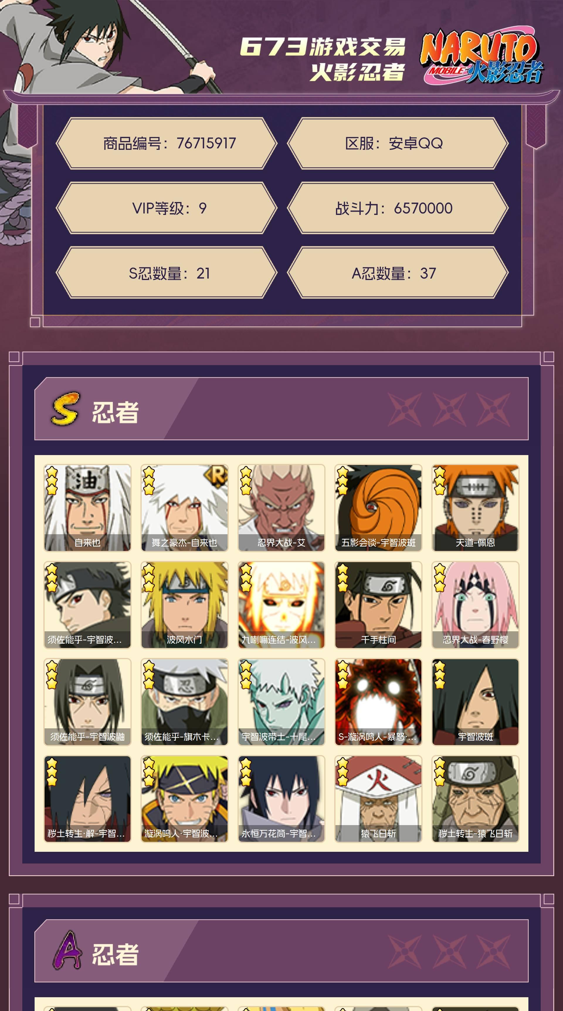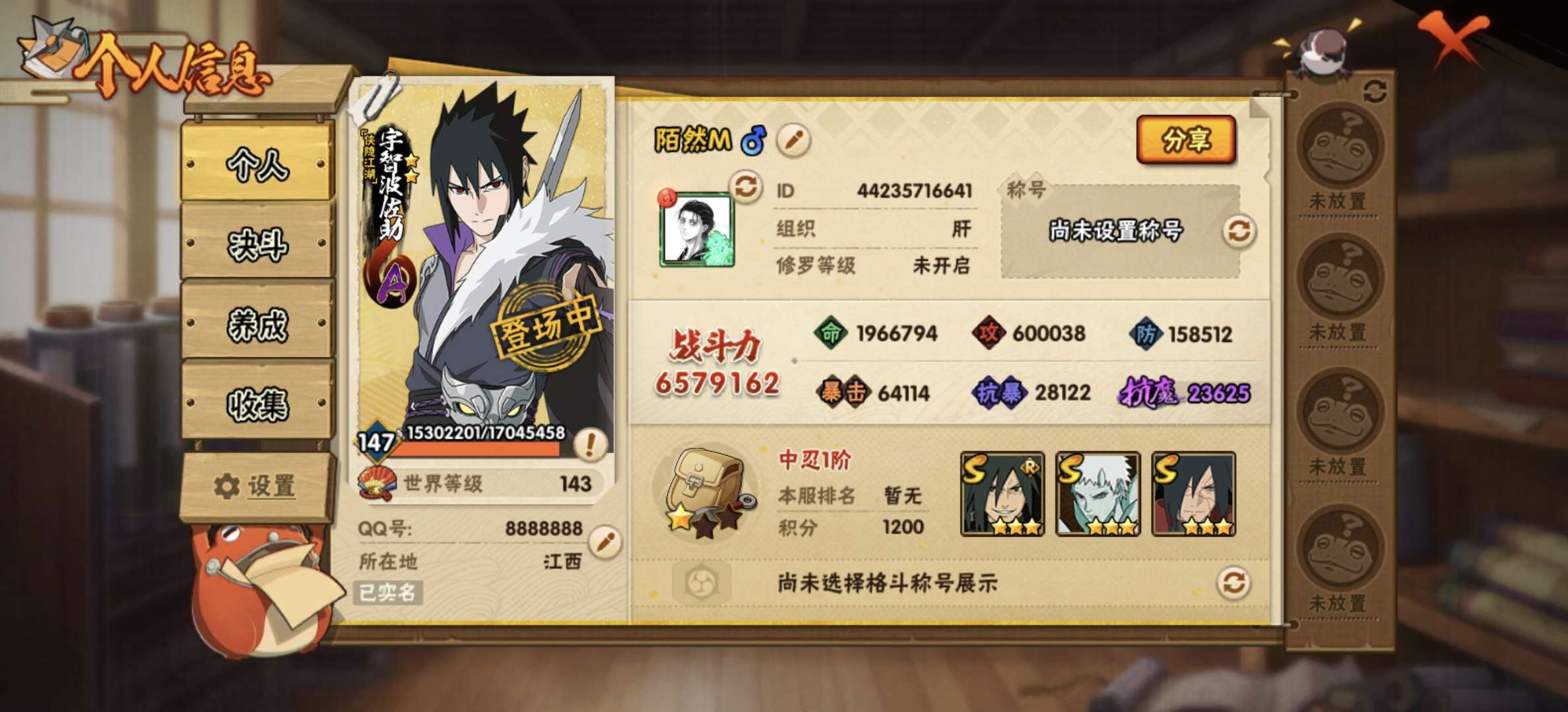 角色等级147 金币46000 战斗力6570000 S忍21 A忍37 9 段位中忍