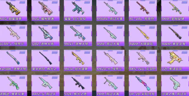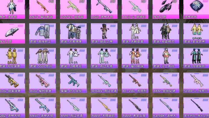【粉色枪皮等级】:UMP45-萌骑冒险(三级),Mk14-福马献瑞(四级),AA12-G-萌骑幻想(一级),MG3-洛神天依(二级)