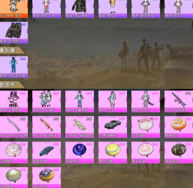 【粉色枪皮等级】:AKM-炫紫旋律(七级),UMP45-萌骑冒险(五级),Kar98K-巳巳如意(五级),Mk14-福马献瑞(五级