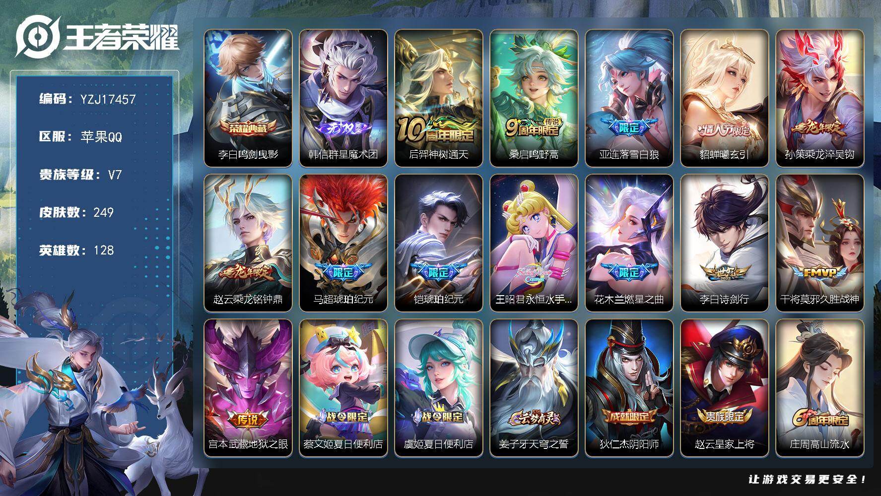 _可二次苹果q-V7印记14小国李白金标钟无艳银标4区标7-249皮肤1典藏1无双13传说【典藏】鸣剑曳影【无双】群星魔术团韩信【传说】落雪白狼曦玄引貂蝉乘龙淬吴钩乘龙铭钟鼎铠琥珀纪元马超琥珀纪元神树通天鸣野蒿燃星之曲永恒水手月亮诗剑行久胜战神地狱之眼【热门】万灵启世涂山容容岱宗逐梦之音白晶晶拒霜思匿光侦查者原初追逐者苍穹之光电玩小子燃音魔法伽罗琥珀纪元百解令雪夜绮愿鹤归松栖男电玩爆裂旋风天秀启明