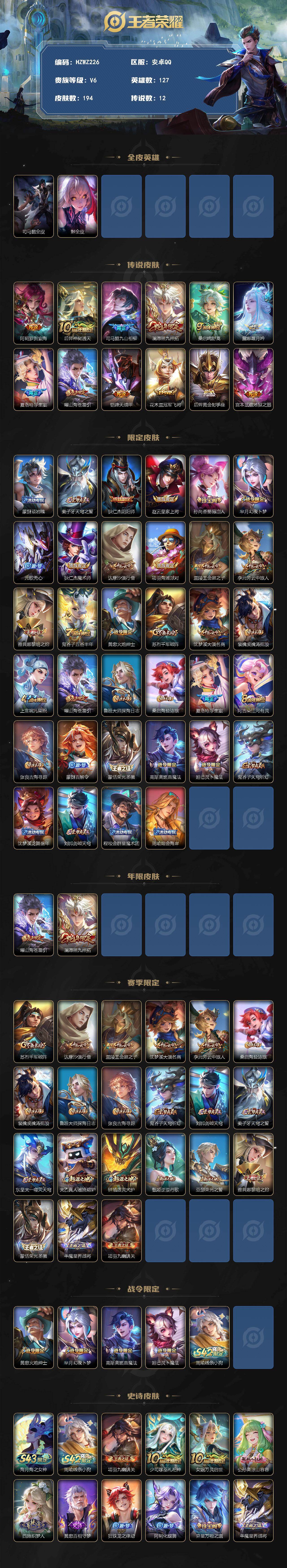 安卓Q-V6-永恒钻石I段位-127英雄-194皮肤-12传说-55史诗