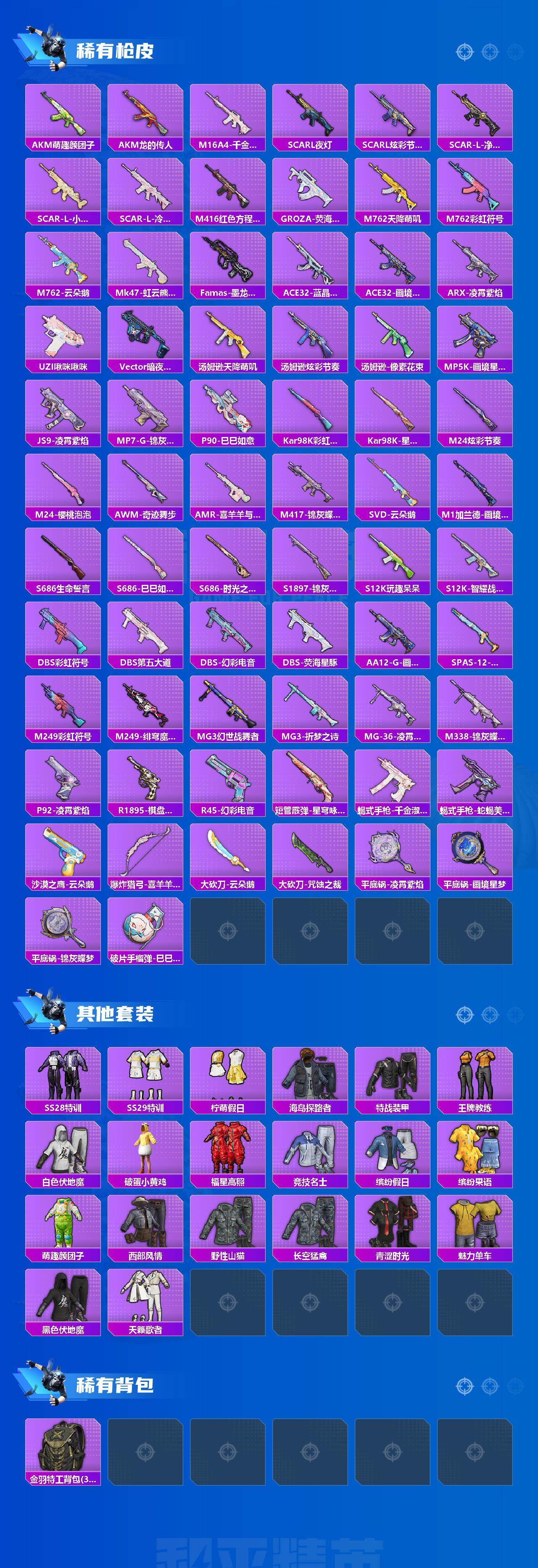 【粉色枪皮等级】:AKS-74U-森灵之息(五级),Kar98K-巳巳如意(五级),Mk14-福马献瑞(五级),MK12-雪月幻音(七级),M249-霁蓝缠春(四级),DP-28-豹影疾电(五级),PKM-萌骑夺宝(三级),MG-36-沧焰双生(五级)
