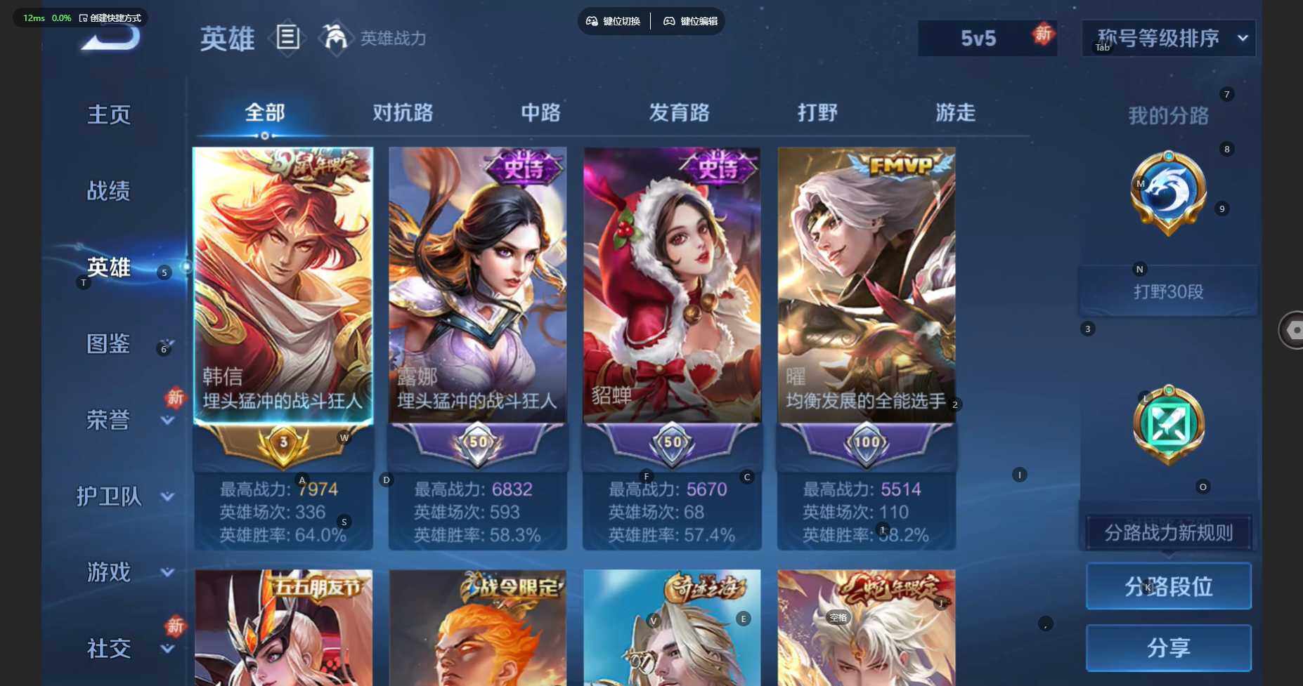 打野30段 金标韩信 安卓WX-V6-至尊星耀II段位-115英雄-101皮肤-6传说-35限定-5按键-7印记