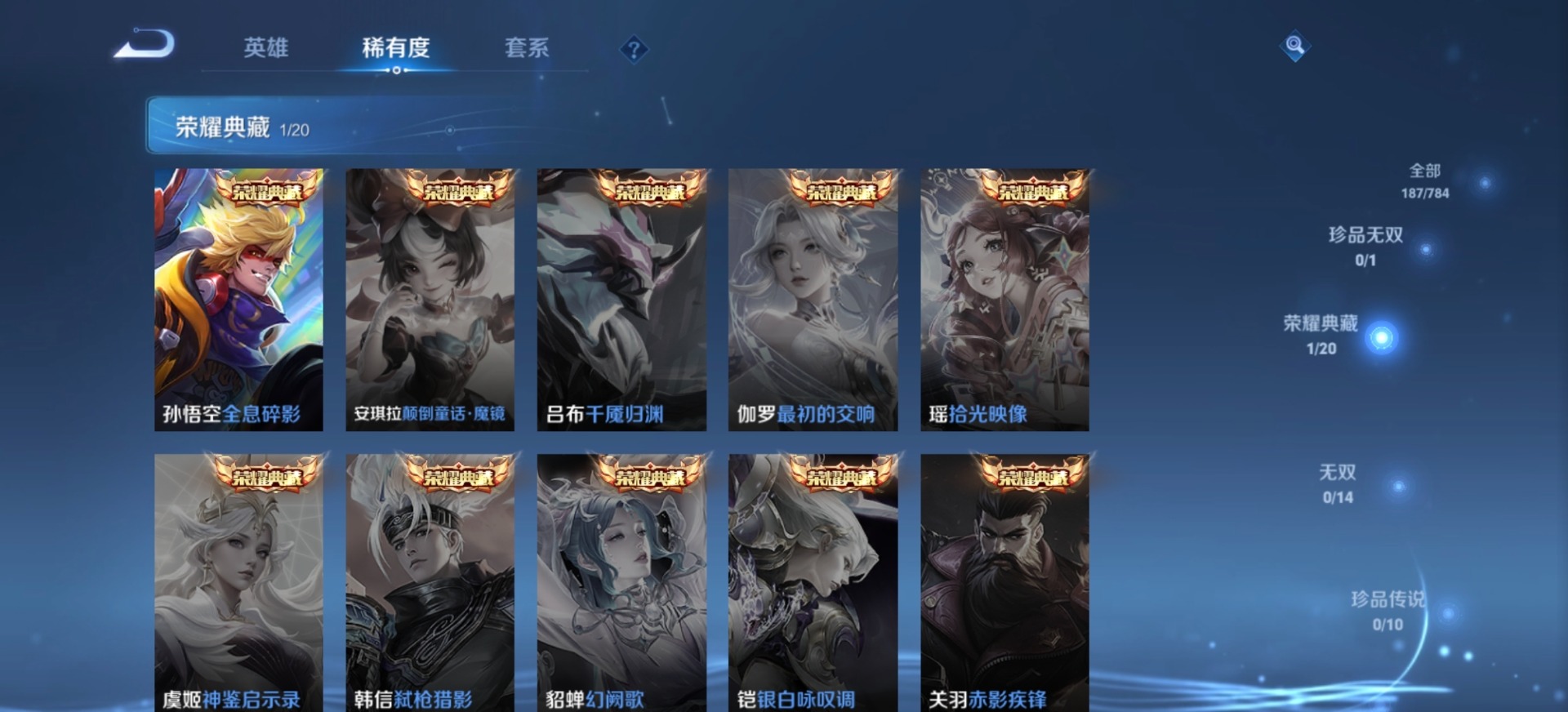 【稀有英雄】大司命,夏洛特(夏师傅),金蝉(唐僧),戈娅,赵云,韩信(韩跳跳),艾琳,不知火舞,娜可露露(鸟人),橘右京(橘子)