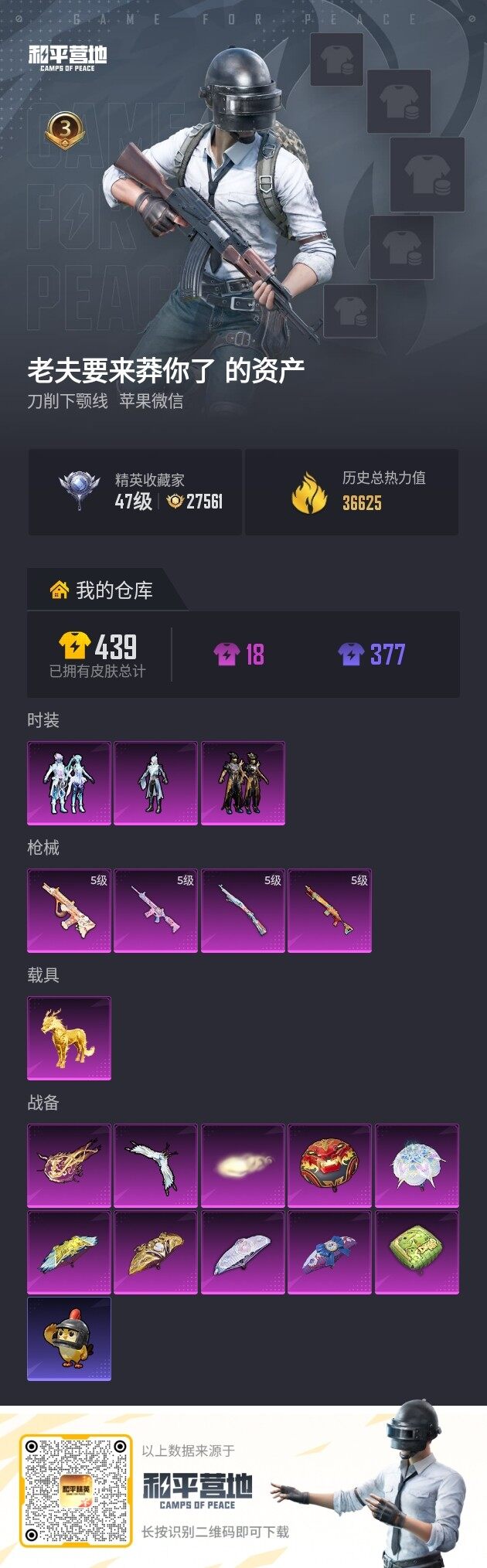 苹果 微信-3粉装-4特效枪-1载具-3粉色飞行器-36625热力值-3王牌印记-91套装-119枪皮