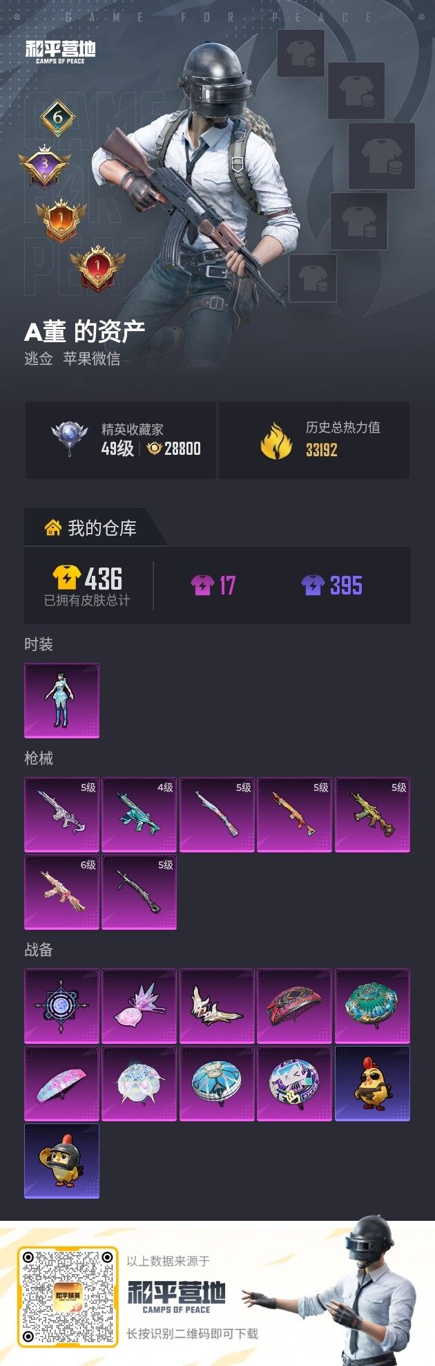 老号V 苹果 微信-1粉装-7特效枪-0载具-3粉色飞行器-33192热力值-6王牌印记-72套装-128枪皮