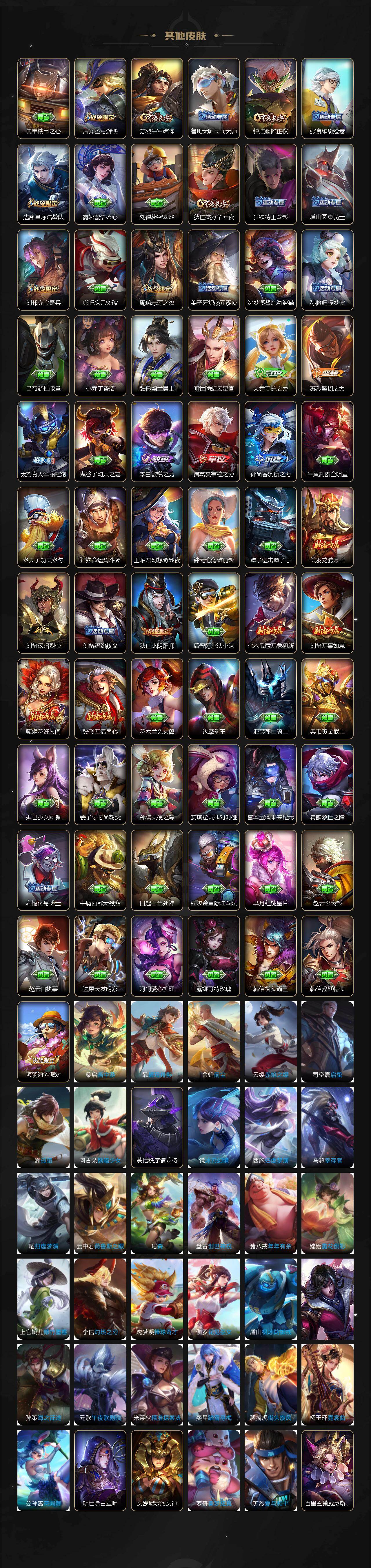 【英雄全皮】:刘禅全皮,元歌全皮,刘邦全皮,孙权全皮,刘备全皮,敖隐全皮,蒙恬全皮,夏洛特全皮,司空震全皮,戈娅全皮,空空儿全皮,影全皮