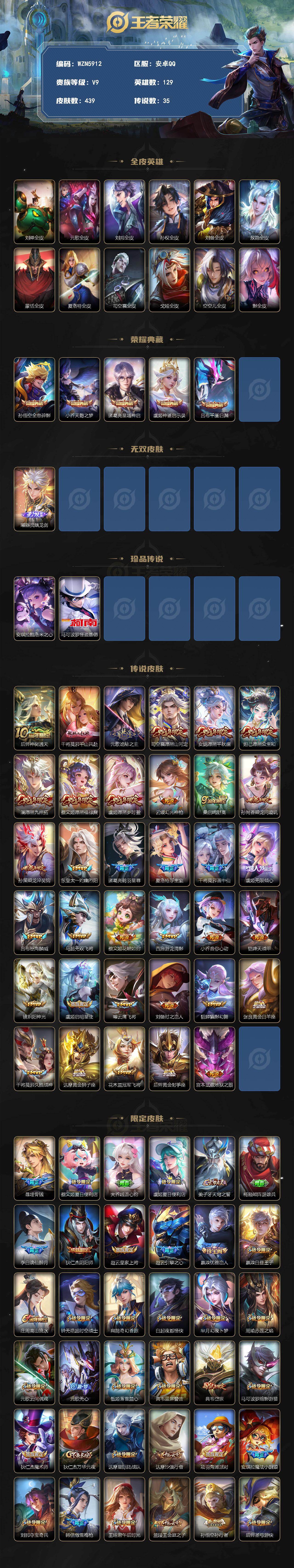 安卓Q-V9-至尊星耀V段位-129英雄-439皮肤-5典藏皮肤-1无双-2珍品传说-35传说-133史诗