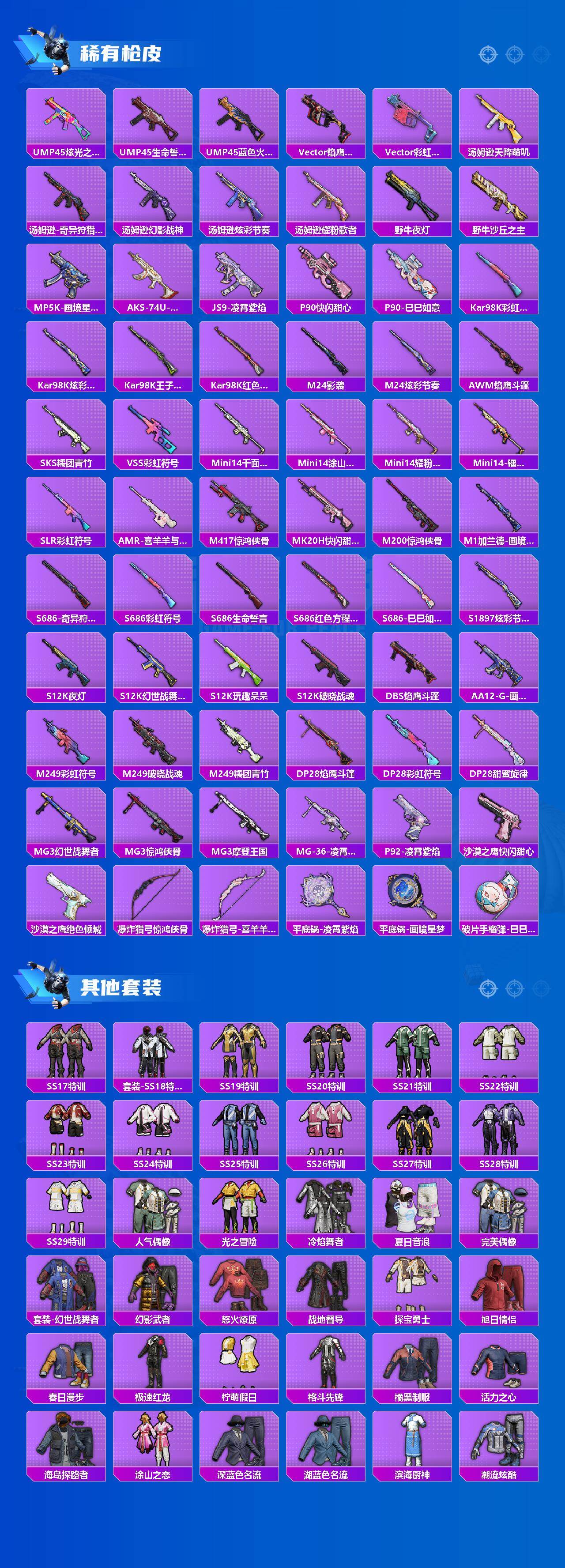 【粉色枪皮等级】:SCAR-L-锦绣绵绵(五级),M416-电玩时刻(五级),AUG-暖羊咩咩(五级),M762-鬼刀(七级),AKS-74U-森灵之息(五级),Kar98K-巳巳如意(五级),Mk14-福马献瑞(五级),AA12-G-萌骑幻想(四级),DP-28-豹影疾电(五级)