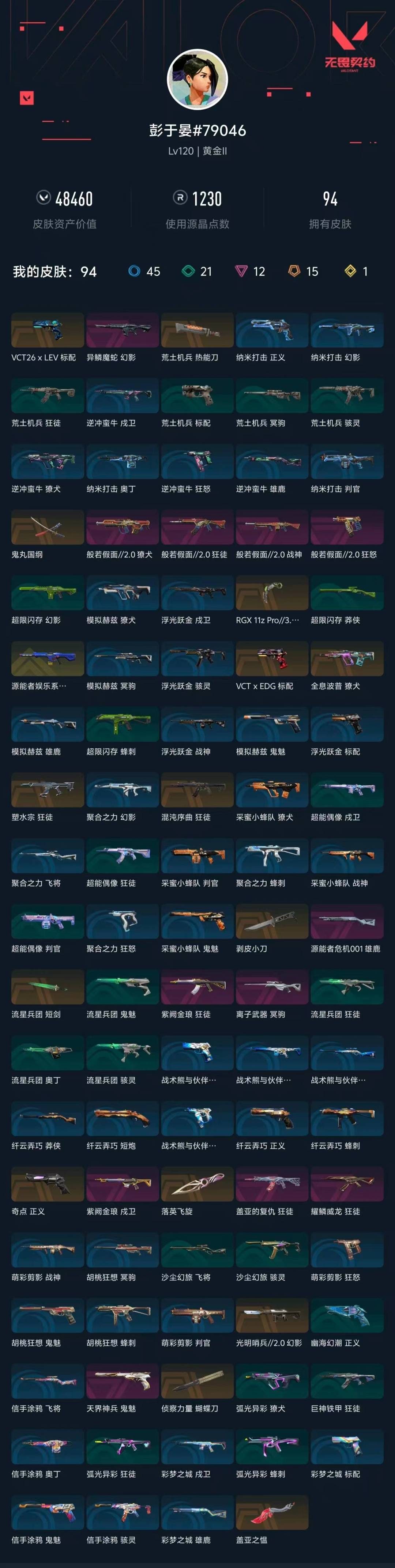 15橙皮 1金皮 12紫皮 94皮肤 29英雄 124卡面 1230已用源晶 黄金段