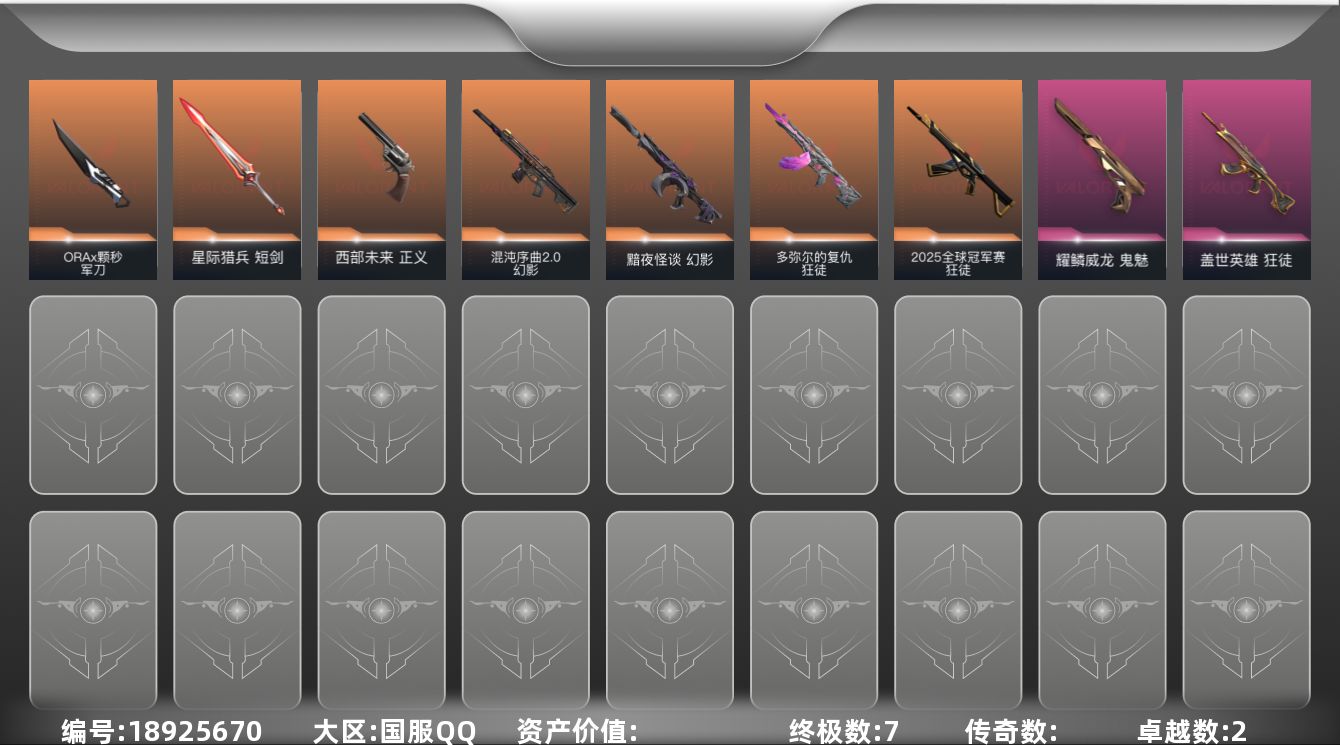 【英雄】:炼狱,暮蝶,壹决,铁臂,捷风,幽影,不死鸟,贤者,猎枭,蝰蛇,零,芮娜,尚勃勒,霓虹,斯凯,夜露,盖可,黑梦【近战武器】:近战武器-ORA x 颗秒 军刀,近战武器-星际猎兵 短剑【狂徒】:狂徒-2025全球冠军赛,狂徒-多弥尔的复仇,狂徒-盖世英雄【幻影】:幻影-黯夜怪谈,幻影-混沌序曲//2.0【骇灵】:骇灵-幽海幻潮,骇灵-无限竞技【标配】:标配-神罚【正义】:正义-西部未来,正义-游戏结束【鬼魅】:鬼魅-耀鳞威龙【狂怒】:狂怒-蒙太奇【卡面】:无畏契约GO!第一卷:芮娜 卡面,
