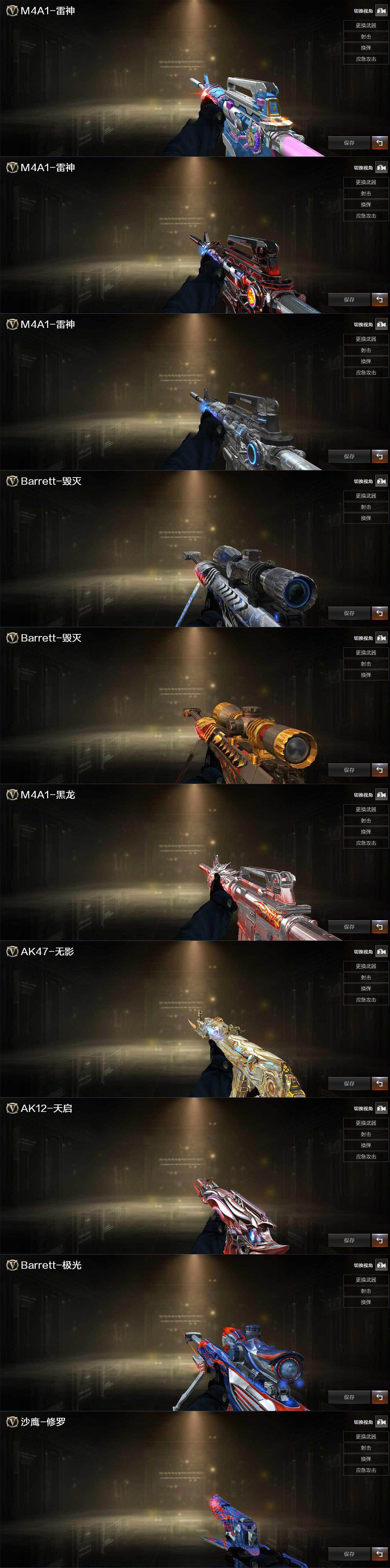 【热门武器】:Scar Light-白虎,M200-幻神,死亡之眼*2,M4A1-黑骑士,汤姆逊-烈龙*6,COP 357-幻灵*2,沙鹰-修罗*2