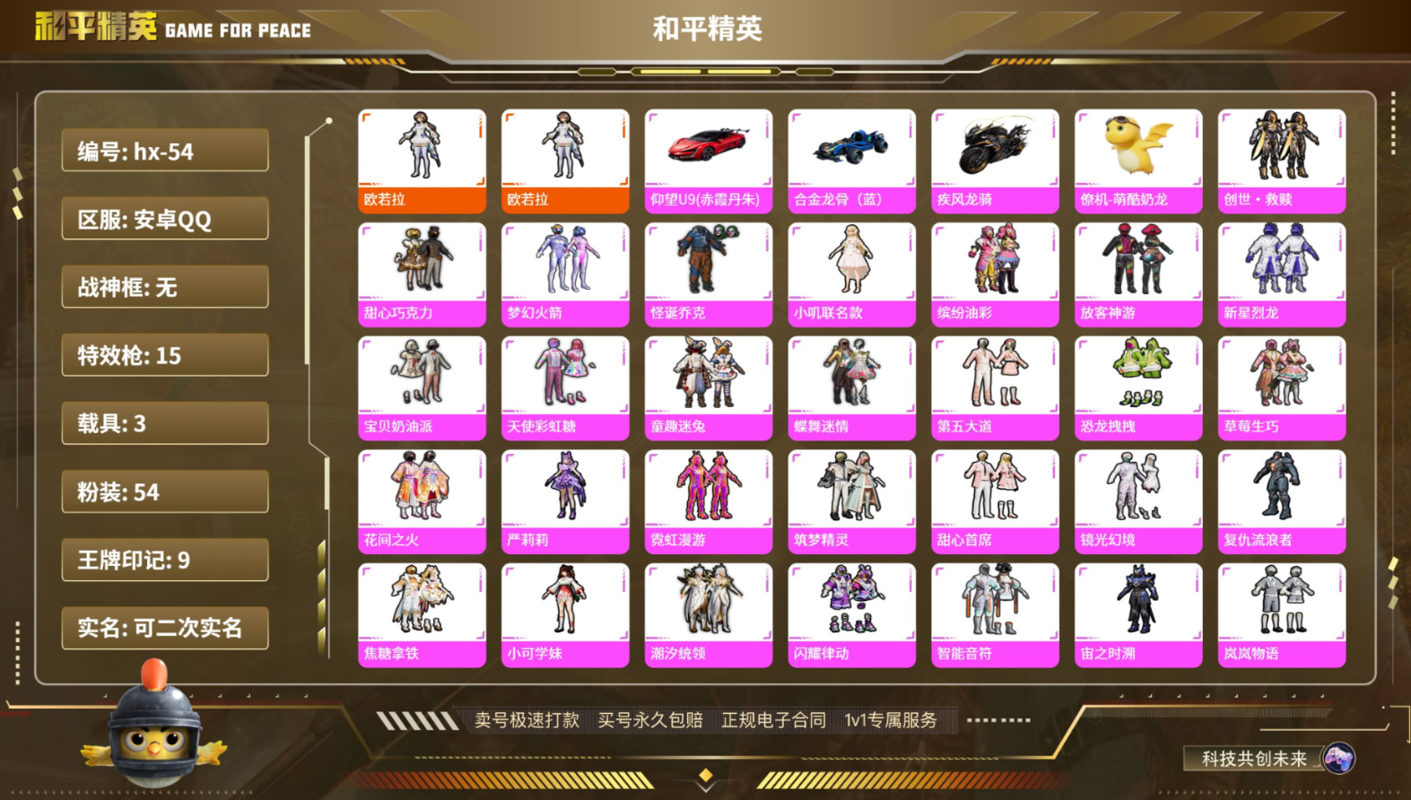 【5级图卡盟浪客战士36特效枪27粉装9载具猫包素材号】 安卓V区-210358热力值-378套装-520枪皮 【1红装】 沙丘之主-图卡盟(5级)【9载具】 玛莎拉蒂粉色 护世瑞兽 合金龙骨绿色 空客蔚蓝之翼僚机 特斯拉X白色 星梦玉骢 幽焰风驰摩托车 晶梦灵驹 辉羽雀灵自行车【10稀有】 剑道训练服 百万伏待背包(猫包) 恶魔人蛛 M416-南瓜骑士 花面小丑 傻乐猪猪背包 冷酷挑战者 AKM-百万伏特 浪客战士 六号树人【27粉装】 宝贝奶油派 天使彩虹糖 童趣迷兔 庄周梦蝶 蝶舞迷情 拂