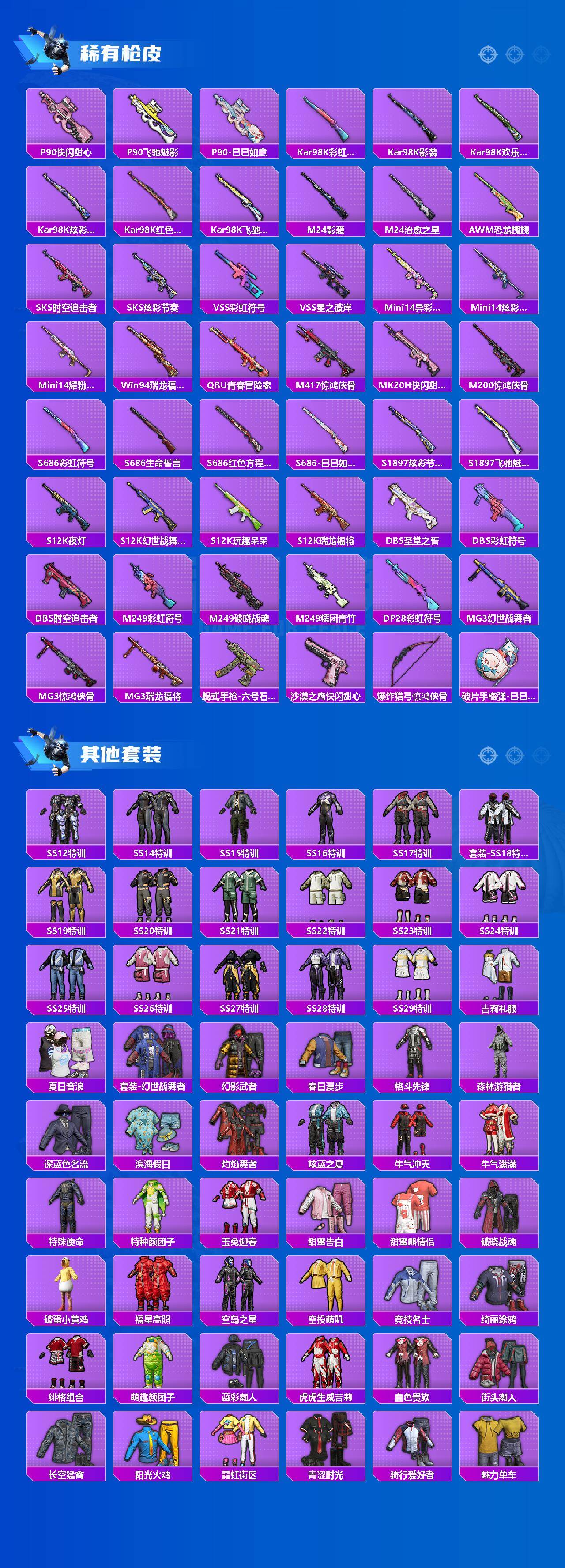 【粉色枪皮等级】:AKM-绿萝繁花(五级),SCAR-L-锦绣绵绵(五级),M416-电玩时刻(五级),GROZA-镜光银凌(五级),AUG-暖羊咩咩(五级),UMP45-萌骑冒险(三级),Kar98K-巳巳如意(五级),Mk14-福马献瑞(五级),DP-28-豹影疾电(五级)