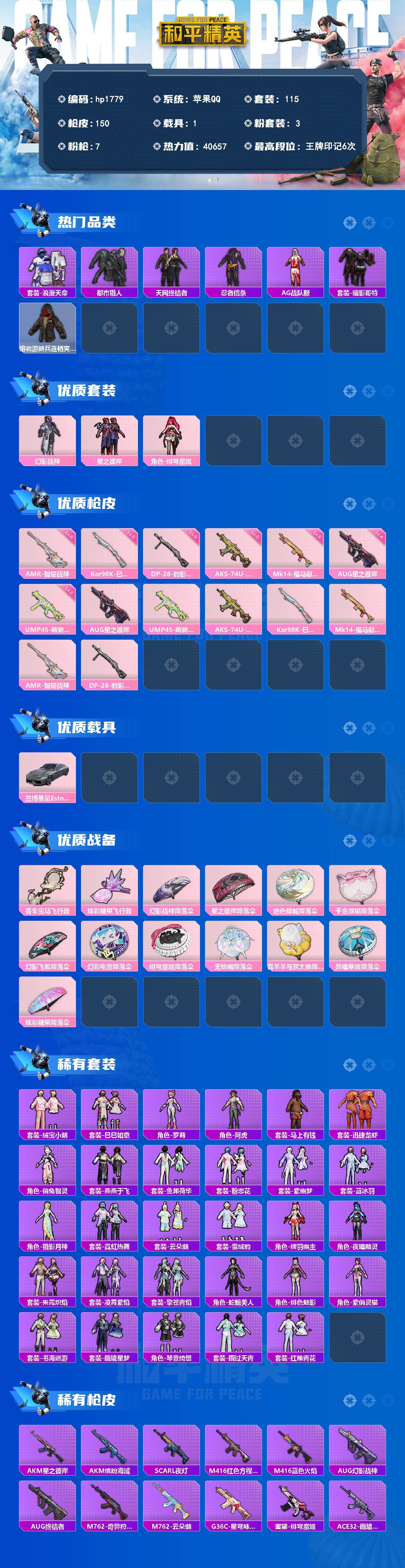 苹果 手Q-3粉装-7特效枪-1载具-2粉色飞行器-40657热力值-6王牌印记-115套装-150枪皮