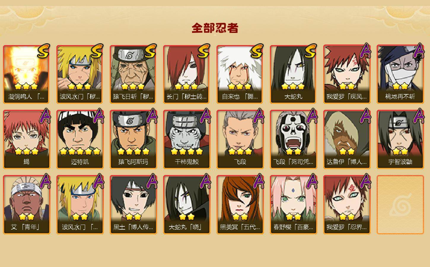 【HYC1863】VIP等级V11/战力770W/S忍数量6/A忍数量17/舞之豪杰-自来也/百豪-春野樱/4星干柿鬼鲛/疾风传-我爱罗/五代目雷影-达鲁伊/死司凭血-飞段/宇智波鼬/桃地再不斩/四代目土影-黑土/3星飞段/秽土转生-猿飞日斩/五代目水影-照美冥/3星蝎/九喇嘛连结-漩涡鸣人/秽土转生-波风水门/忍界大战-我爱罗/5星迈特凯/大蛇丸/青年-艾/秽土转生-长门/晓-大蛇丸/青年-波风水门/4星猿飞阿斯玛