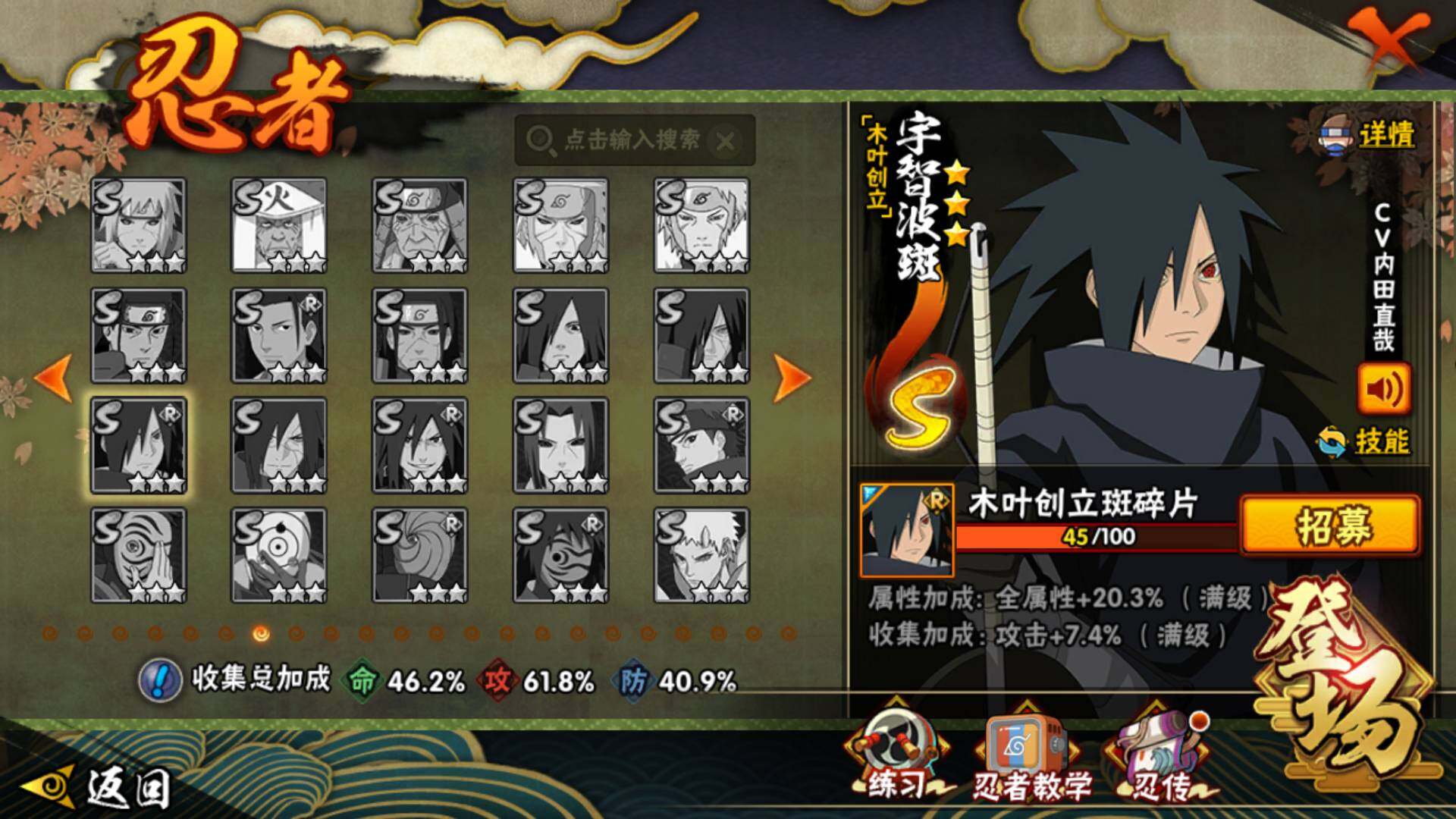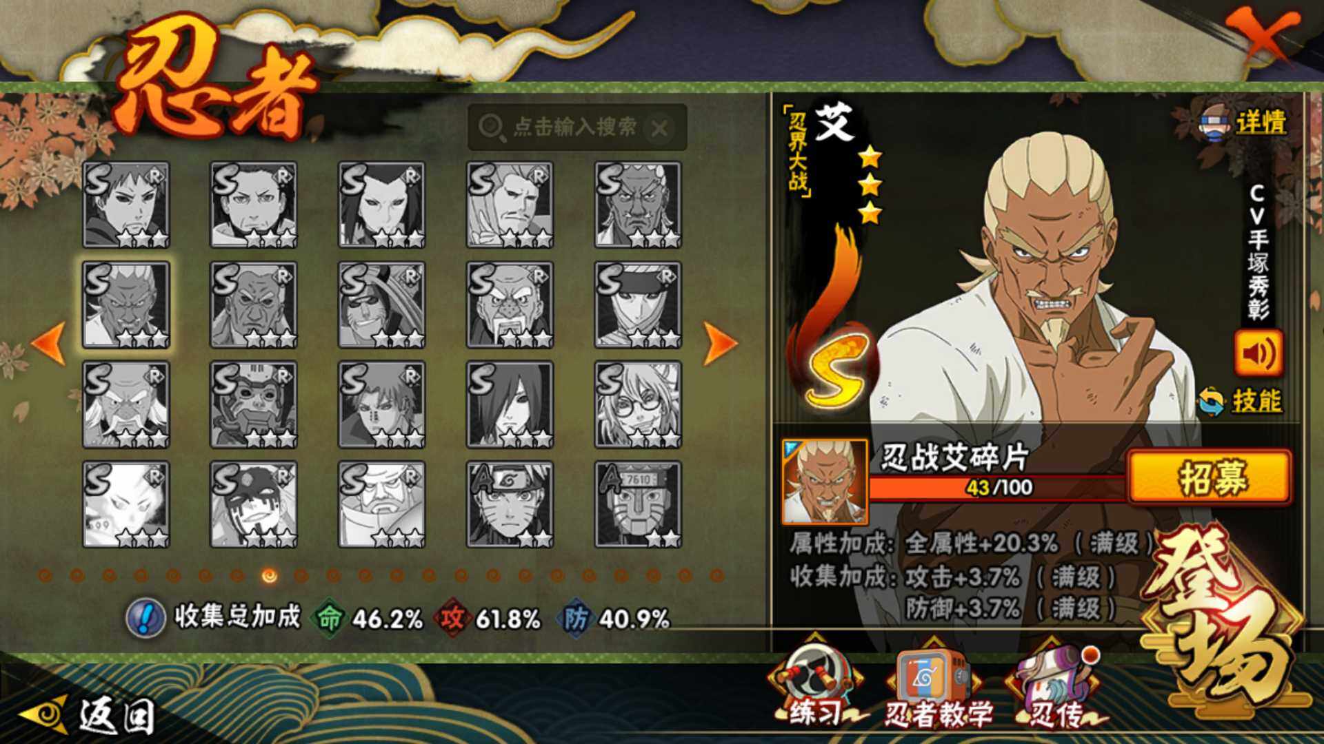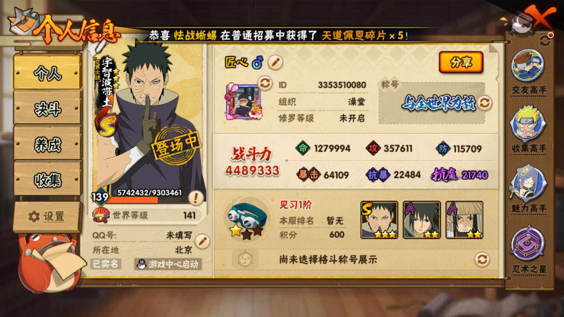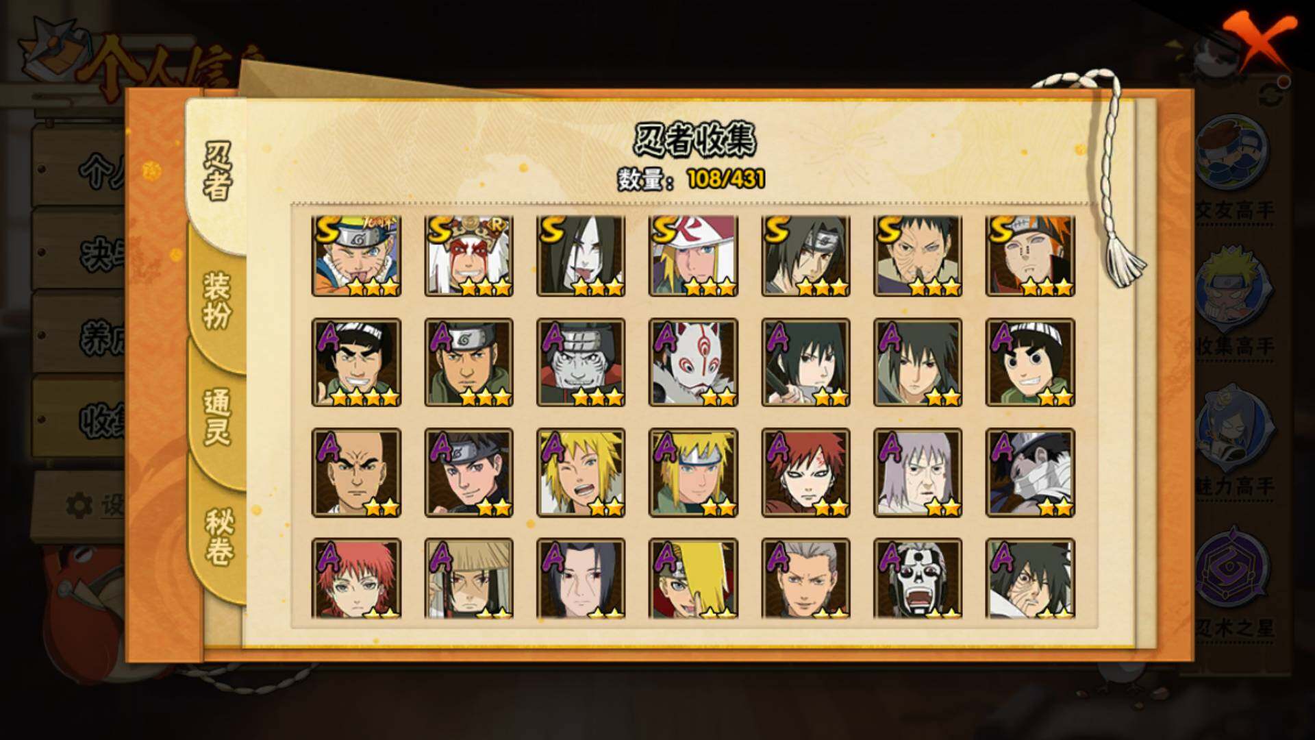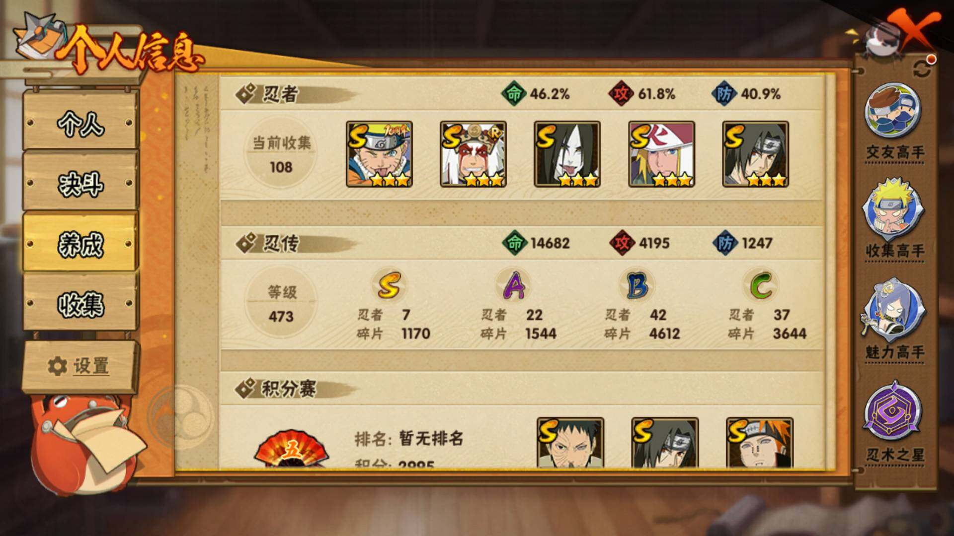 v9,447w战力,7S级忍者数-22A级忍者数,热门A,面麻,新春水门,夏日鼬,暴怒带土等。