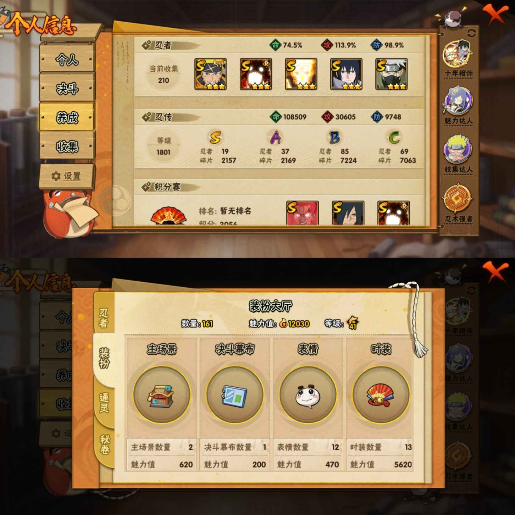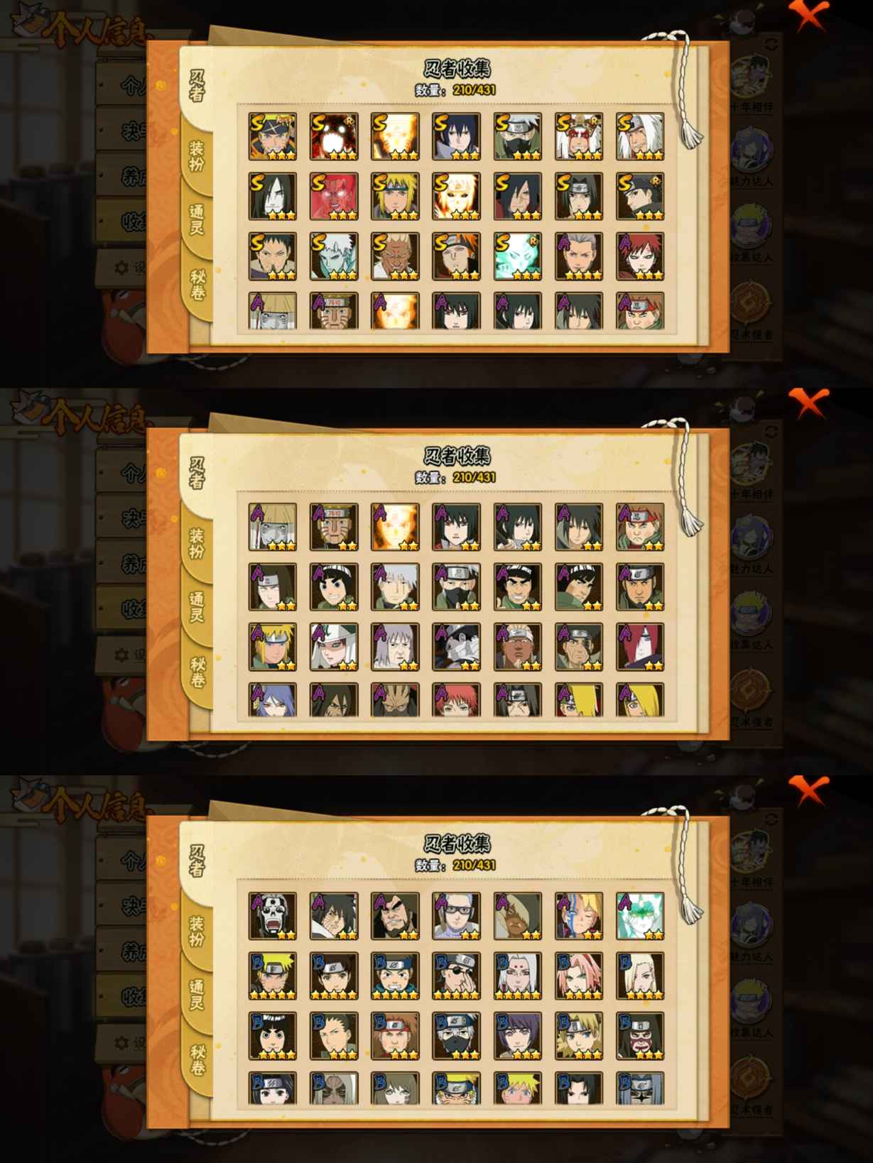MHY4216安卓QQ【区服】2859【等级】147【S级数量】19【A级数量】37【B级数量】85【C级数量】69【S级】漩涡鸣人「暴怒·第六尾」 自来也「传说中的三忍」 大筒木舍人「最终章」 佩恩「天道」 宇智波带土「忍界大战」 漩涡鸣人「九喇嘛连结」 波风水门「九喇嘛连结」 宇智波鼬「须佐能乎」 宇智波佐助「永恒万花筒」 宇智波止水「须佐能乎」 大蛇丸 迈特凯「死门」 宇智波带土「十尾人柱力」 艾「忍界大战」 旗木卡卡西「须佐能乎」 宇智波斑「秽土转生·解」 漩涡鸣人·宇智波佐助 自来也「