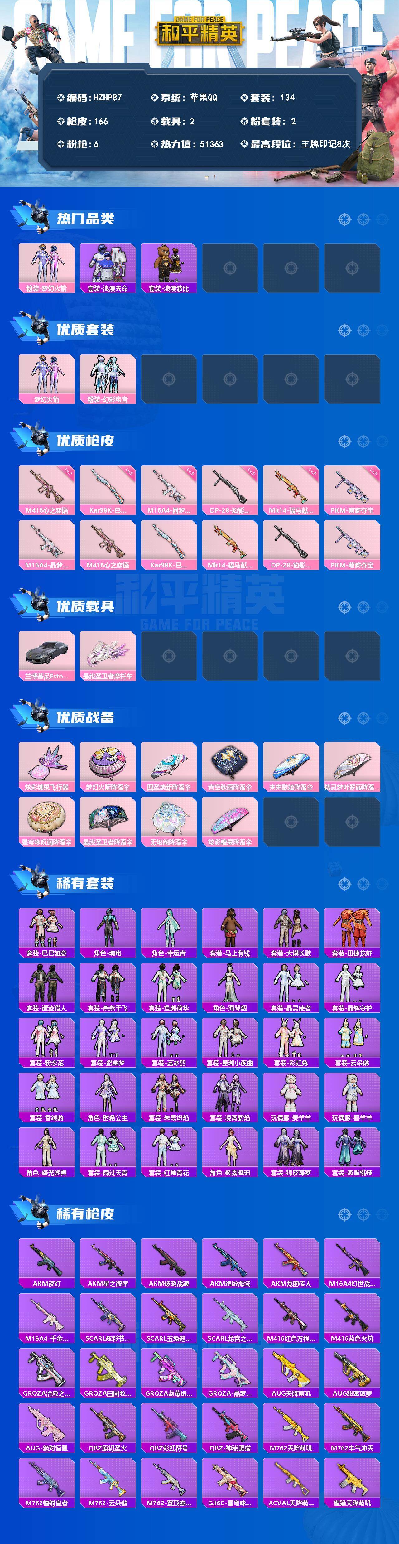 苹果 手Q-2粉装-6特效枪-2载具-1粉色飞行器-51363热力值-8王牌印记-134套装-166枪皮